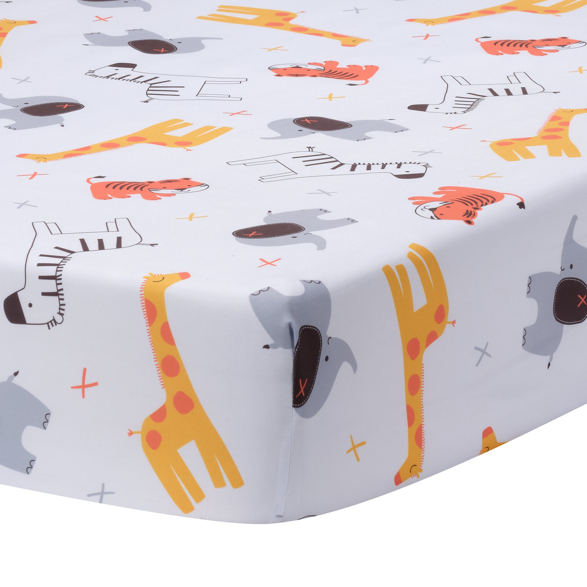 Des animaux de la jungle décorent ce drap-housse pour lit bébé sur un fond blanc immaculé. Il représente des girafes dorées, des...