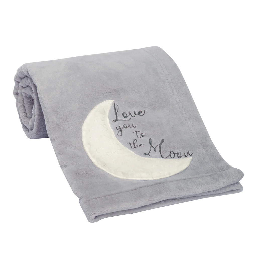 Couverture de poussette en polaire douce et confortable. Lune appliquée en sherpa blanc duveteux. Les mots "Love you to the ...