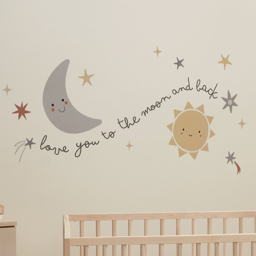 - Comprend une lune souriante, un soleil, des étoiles et les mots « love you to the moon and back ».