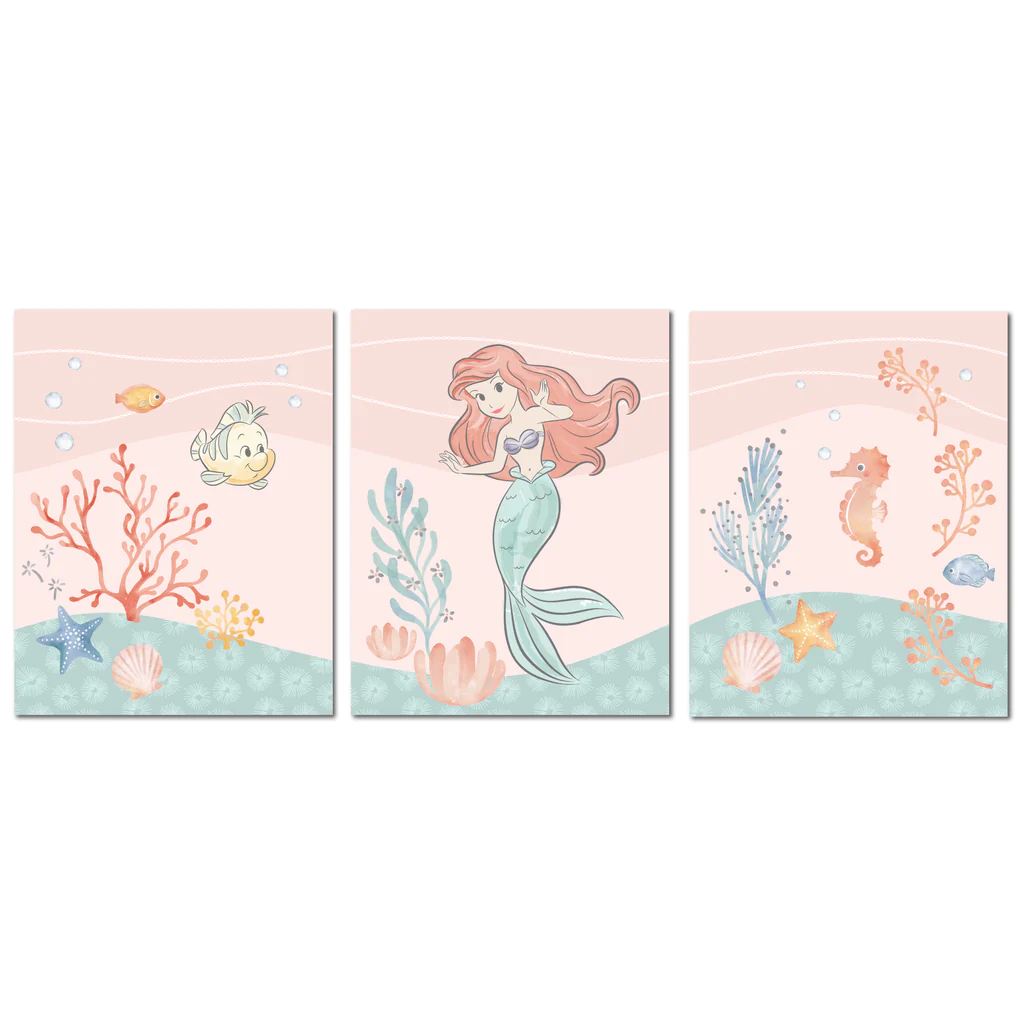 Cet art mural non encadré est un excellent moyen d'introduire la magie de La Petite Sirène dans la chambre de votre enfant. Trois œuvres d'art mural non encadrées de 11" X 14" imprimées professionnellement sur du papier cartonné mat de 300 GSM sont incluses. Les impressions représentent Ariel, Flounder, un hippocampe, du corail, des étoiles de mer et des coquillages. Vous pouvez les encadrer ou les accrocher directement au mur. Les cadres et les pastilles adhésives ne sont pas inclus.