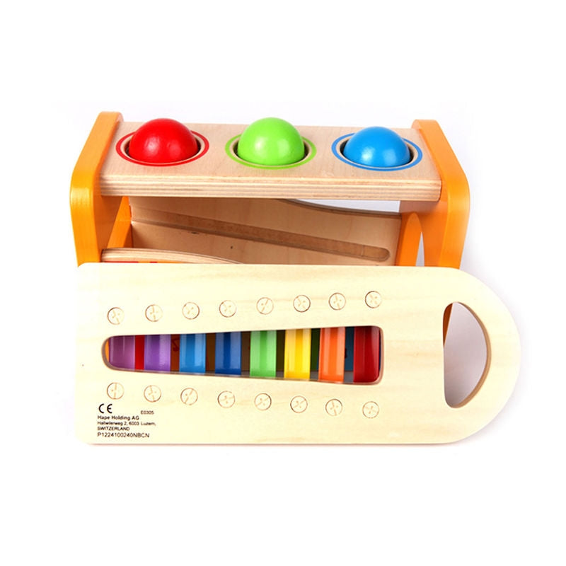 Trois balles à frapper pour les faire tomber sur le xylophone qui jouera une petite mélodie. Le xylophone peut être retiré du banc pour en jouer seul.