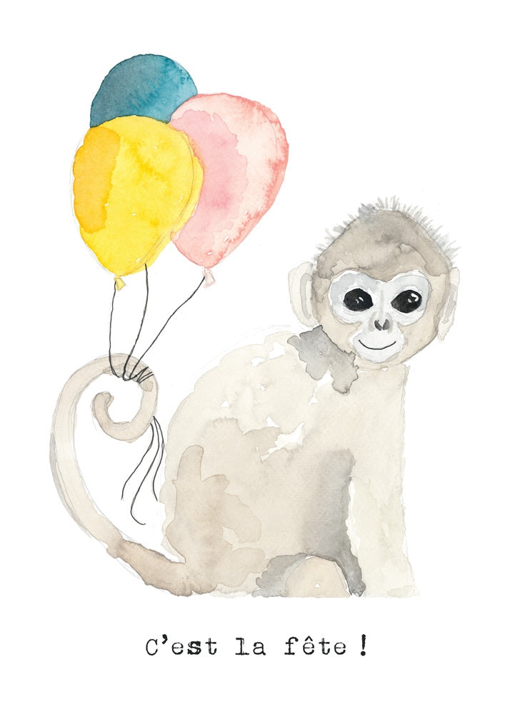 - Dessin d'un petit singe tenant des ballons avec texte: C'est la fête! sur le dessus de la carte.