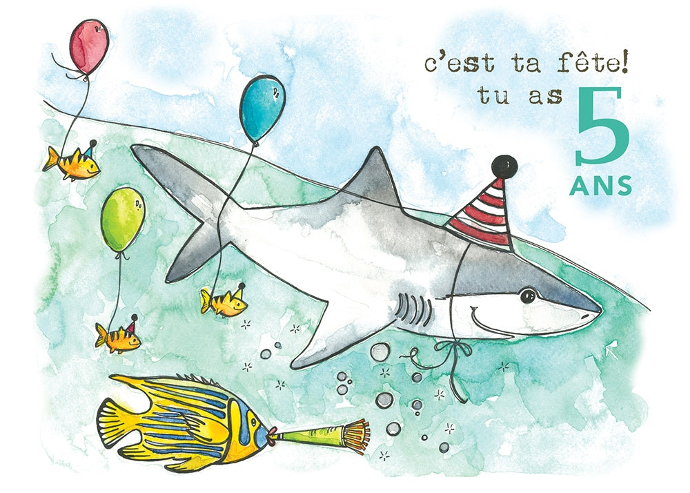 - Dessin de requin avec texte: C'est ta fête! Tu as 5 ans sur le dessus de la carte.