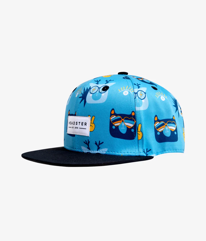 La casquette Teddy's cool de Headster Kids dans les tons de bleu est trop cool pour l'école. Avec ses lunettes de soleil et son signe de la paix, Teddy vit la vie! Sa palette droite est noire unie et son corps rigide est complété par une étiquette blanche au nom de la marque placée au centre. C’est la casquette parfaite pour les soirées tapis rouge ou une visite de Mamie! La fermeture arrière est faite d'une attache en plastique (style snap) qui permet un ajustement confortable et adapté pour vos enfants.