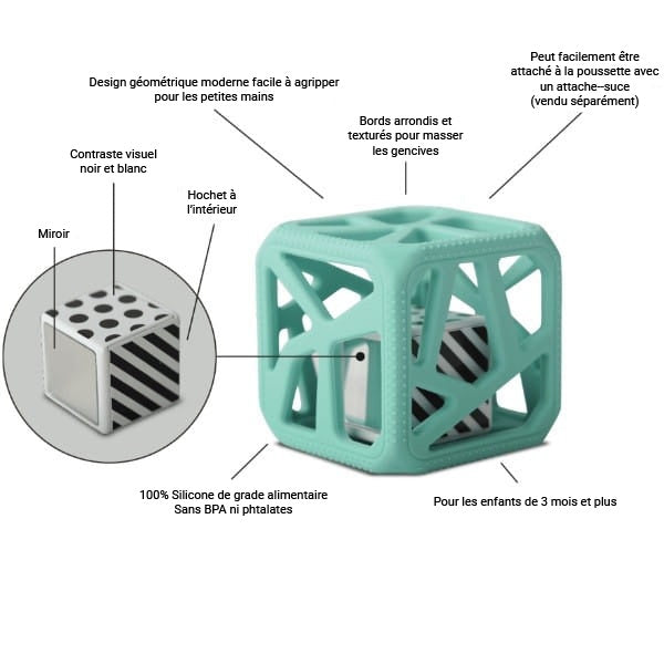 Offert dans différents choix de couleurs le Chew Cube est fait de silicone de grade alimentaire à 100%.