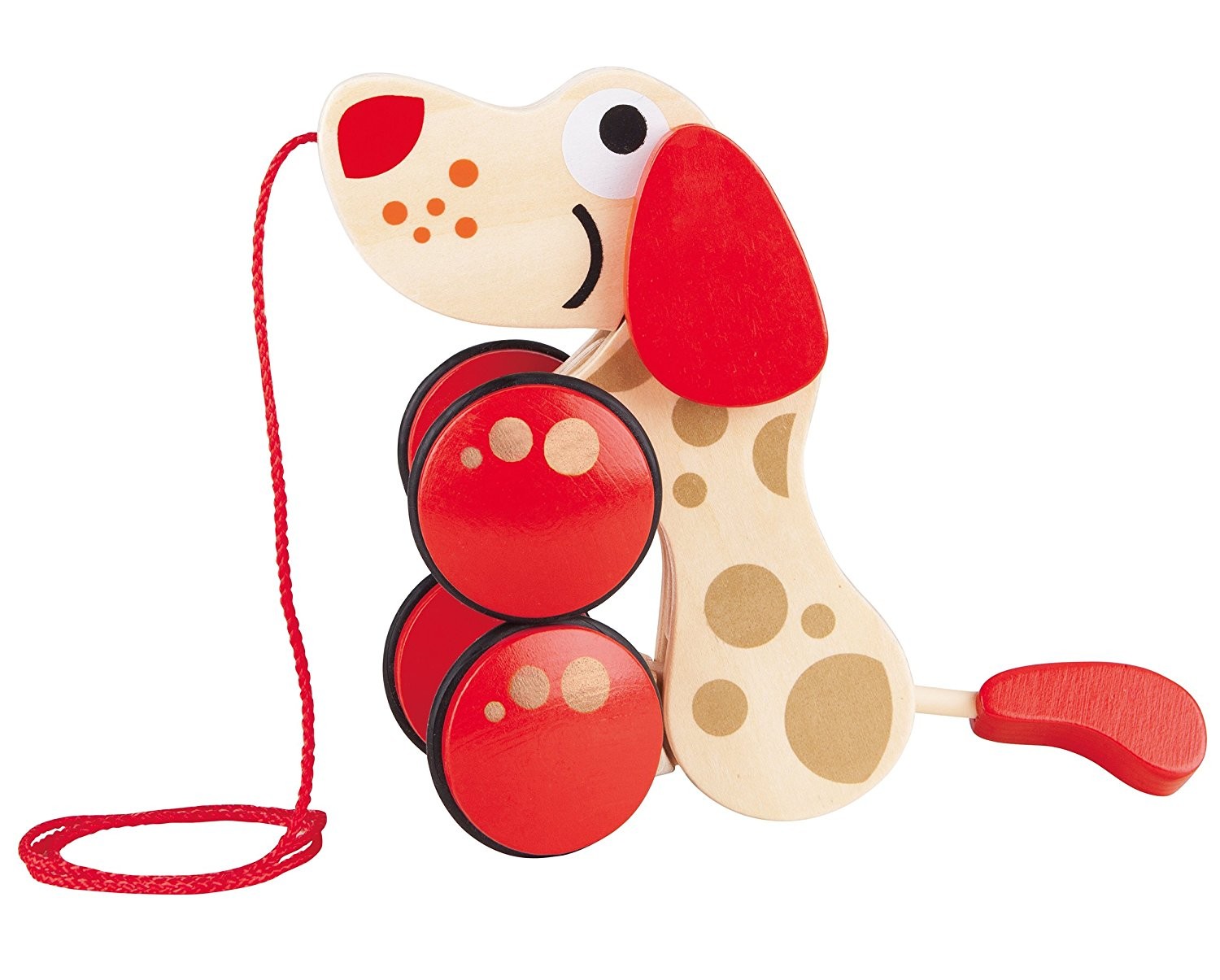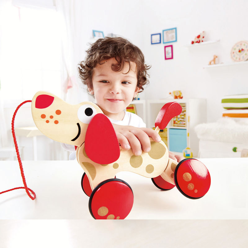 Petit chiot en bois à tirer et faire rouler. On peut le changer de position en bougeant ses pattes arrières. Un jouet mignon et robuste!