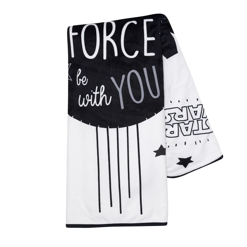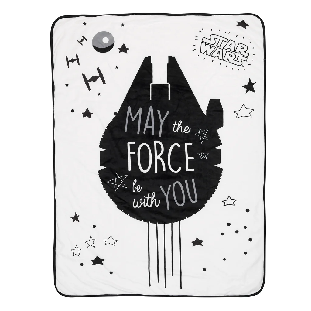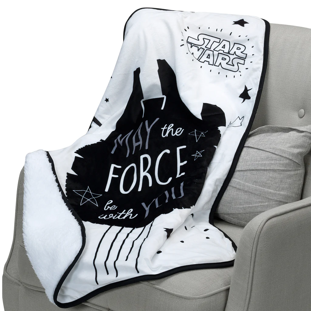 Votre petit padawan (Jedi en formation) va adorer cette couverture pour bébé en forme de Faucon Millenium, sous licence officielle. Le grand Faucon noir mesure 23" de long et est représenté au centre de cette douce couverture en minky. MAY THE FORCE BE WITH YOU est imprimé en gris et blanc avec des Tie Fighters, l'Étoile de la Mort, des étoiles et les mots Star Wars. Le dos de la couverture est en faux shearling blanc.
