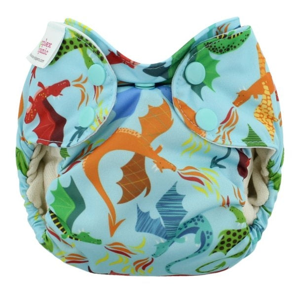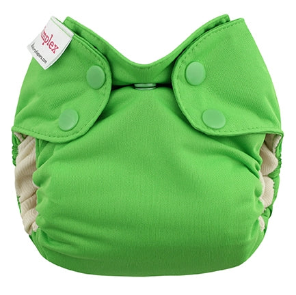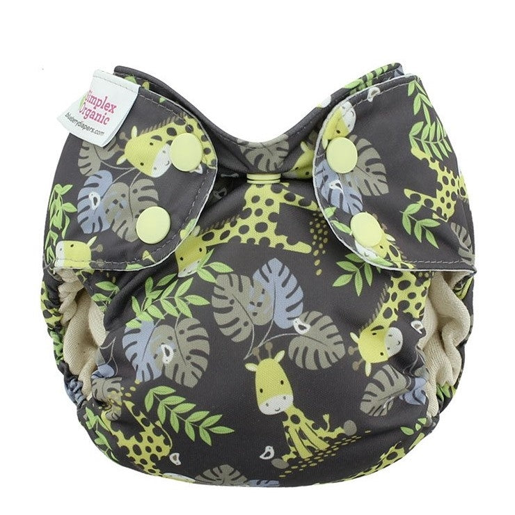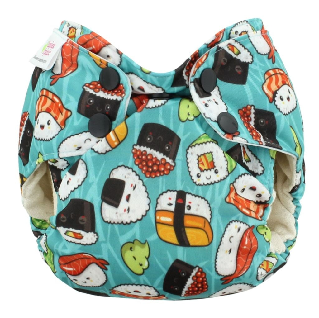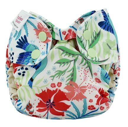 Couche tout-en-un qui combine les avantages de la couche tout-en-un tout en permettant un ajustement du niveau d'absorption comme pour une couche à poche. Convient aux nouveaux-nés de 6 à 16 livres. L'extérieur est fait de polyester laminé pour imperméabilisé la couche, l'intérieur est en coton biologique et la doublure absorbante intégrée à la couche est en polyester. La couche est munie d'une ouverture de chaque côté qui permettent d'insérer des inserts à l'intérieur pour augmenter le niveau d'absorption. Les inserts sortiront par eux-mêmes lors du lavage. La doublure absorbante étant attachée seulement d'un côté, elle sortira également de la poche lors du lavage. La doublure absorbante intégrée peut être utilisée autant à l'intérieur qu'à l'extérieur de la poche.