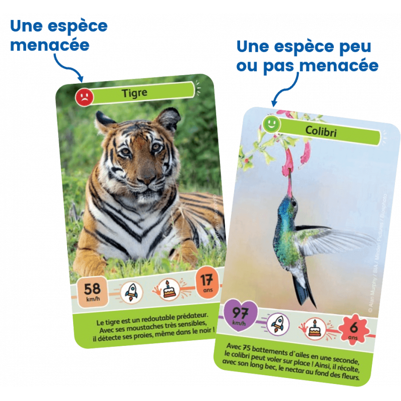 Exemple de bataille : Le tigre vit jusqu’à 17 ans… peut-il remporter la bataille contre le colibri ou la rainette ? Oui, il l’emporte car il vit plus longtemps que les autres espèces (6 ans pour le colibri et 4 ans pour la rainette).