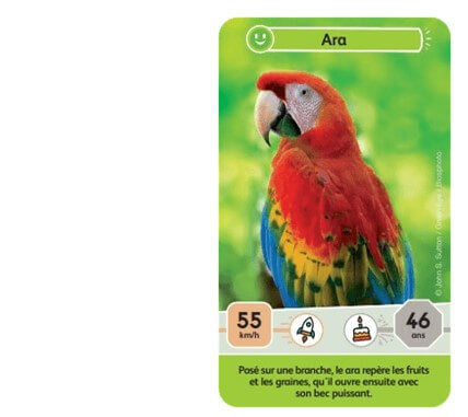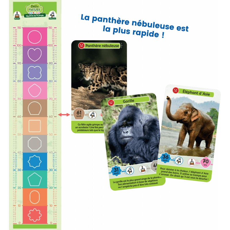 Chaque carte Défis Nature Junior - Mystères de la jungle est illustrée d’une photographie de l’animal dans son environnement naturel, de ses caractéristiques (vitesse max et âge max) et contient un petit texte éducatif pour en savoir plus sur l’espèce. Parfait pour apprendre en s’amusant !