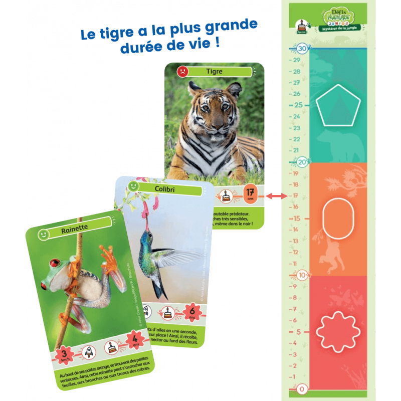 VARIANTES DES RÈGLES DU JEU DÉFIS NATURE JUNIOR - MYSTÈRE DE LA JUNGLE ! Pimentez vos parties de jeu avec la variante expert ! Le degré de menace qui pèse sur les espèces peut retourner la situation. Si l’animal d’un joueur est menacé (pastille rouge) alors que celui du joueur qui a ouvert la manche ne l’est pas (pastille verte), il peut changer la caractéristique d’affrontement ! Il existe également une règle spécifique pour jouer seul ! Le joueur choisit une caractéristique, retourne les 5 cartes qu’il a préalablement piochées et tente de trouver l’animal le plus rapide ou celui qui vit le plus longtemps !