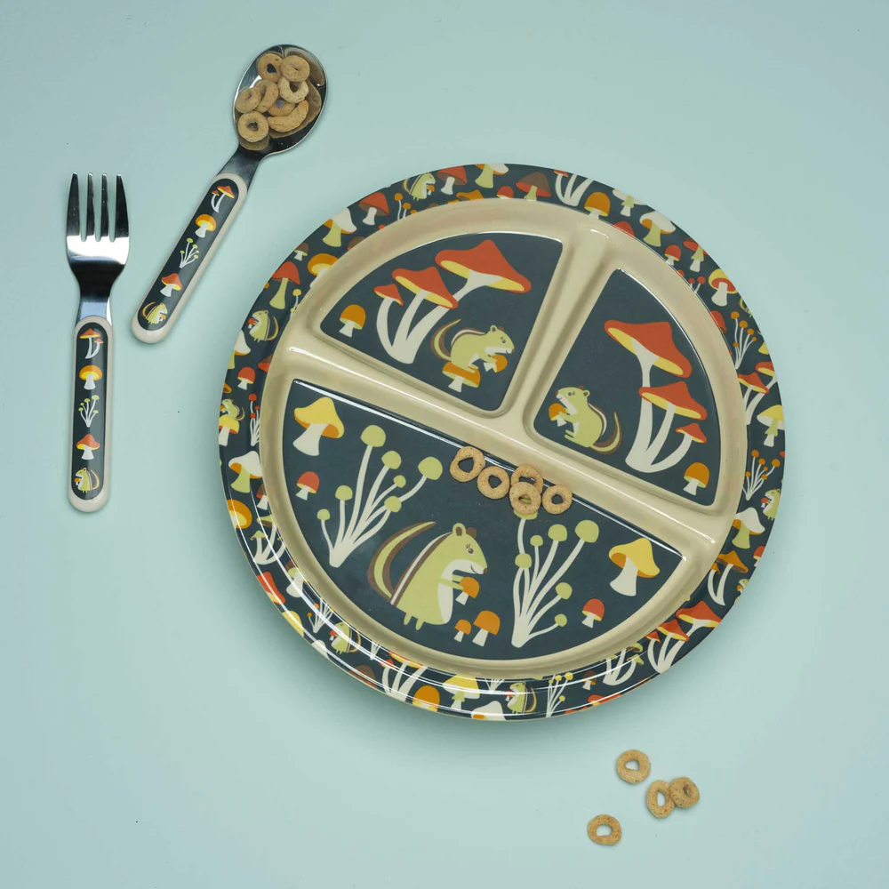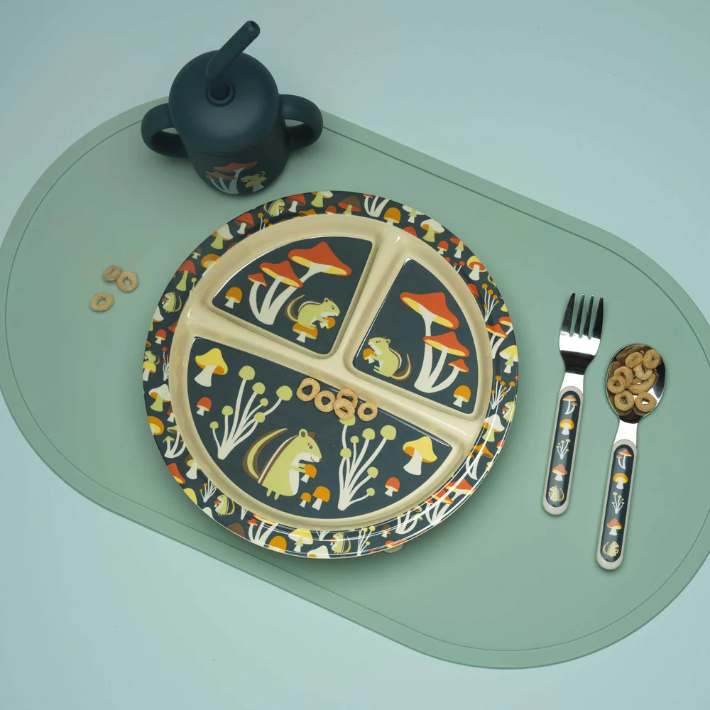 Joli ensemble d'ustensiles aux motifs de champignon. L'ensemble comprend une cuillère, une fourchette et un coffret de plastique avec fermeture aimantée pour transporter les ustensiles. Les ustensiles sont en acier inoxydable et sont muni d'un manche en plastique sans BPA. Parfaits pour les petites mains.