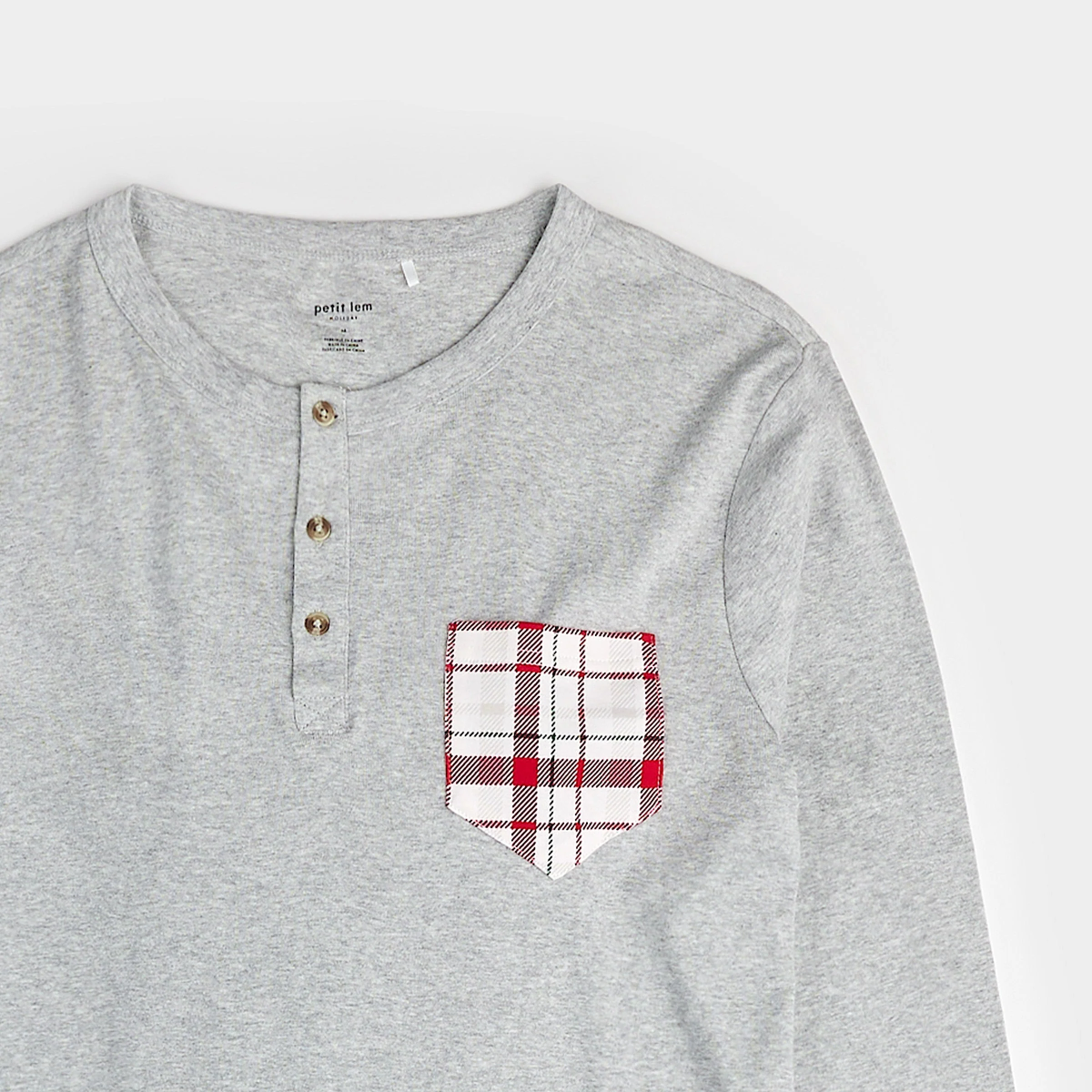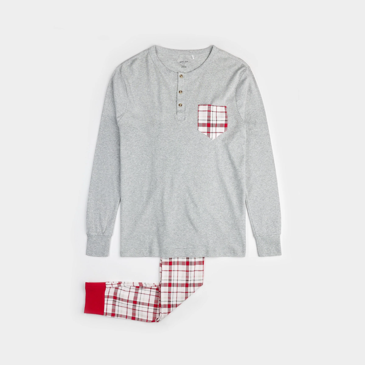 Le haut gris à manches longues est doté d'une boutonnière de style henley et d'une poche poitrine à carreaux. Le pantalon est imprimé de notre motif à carreaux festif, avec des bordures rouges au niveau des chevilles et une bande de taille élastique. Fabriqué à partir de coton biologique, l'ensemble est super doux, respirant et confortable.