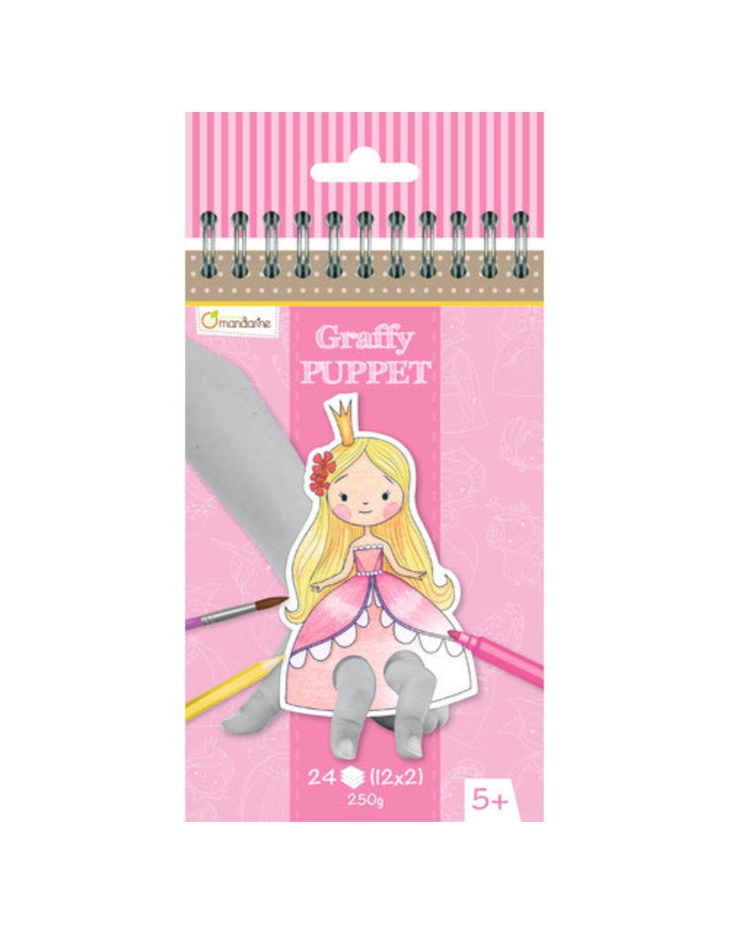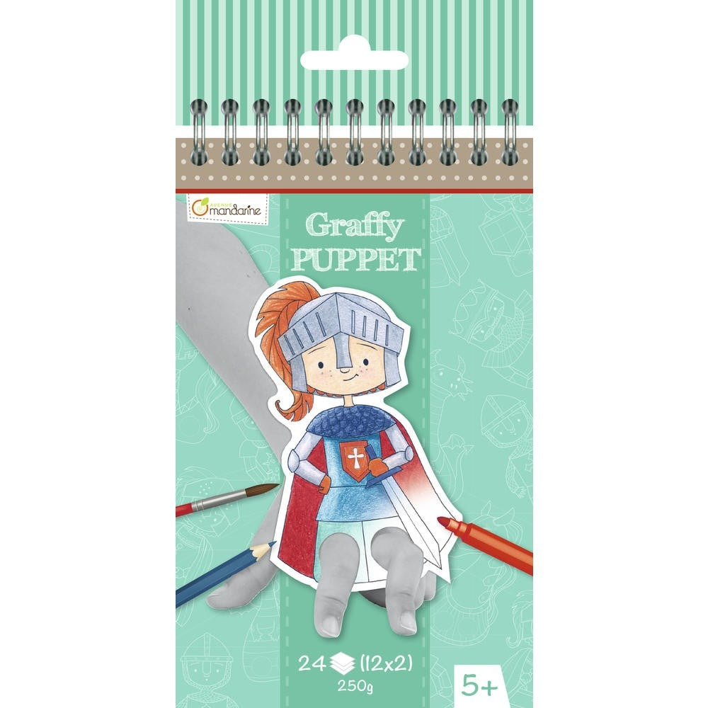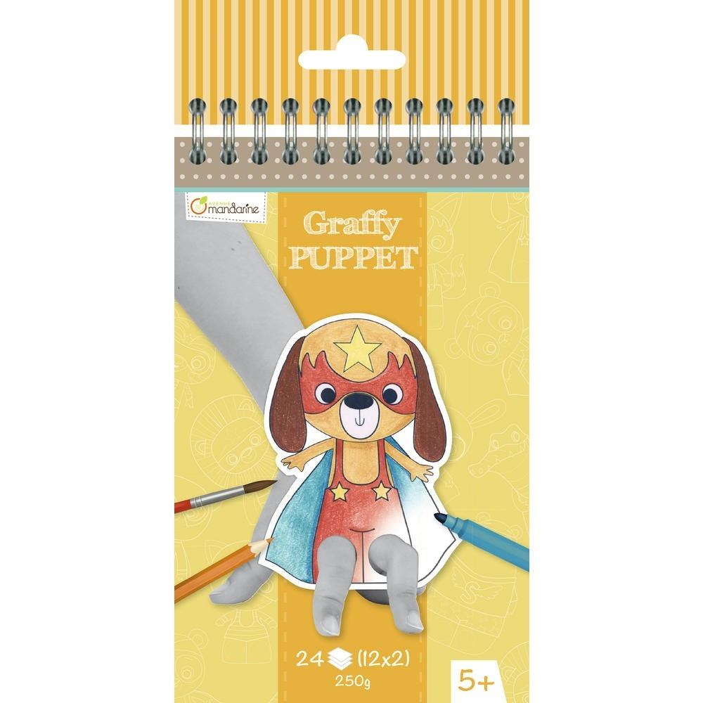 Voici un carnet de dessin amusant de la compagnie Avenue Mandarine. Deux ouvertures sont faites dans le dessin pour que votre enfant puisse y insérer deux doigts, une fois que le dessin est complété. Il peut ensuite jouer avec sa marionnette fraîchement dessinée. Un monde d'imagination s'ouvre à lui au travers des différents personnages qui sont dans son Graffy Puppet. Chaque personnage est répété deux fois pour éviter la peine causée par un bris d'un personnage ou encore si votre enfant n'est pas satisfait du premier personnage colorié. Un plaisir créatif qui laissera libre cours à l'imagination de votre enfant.