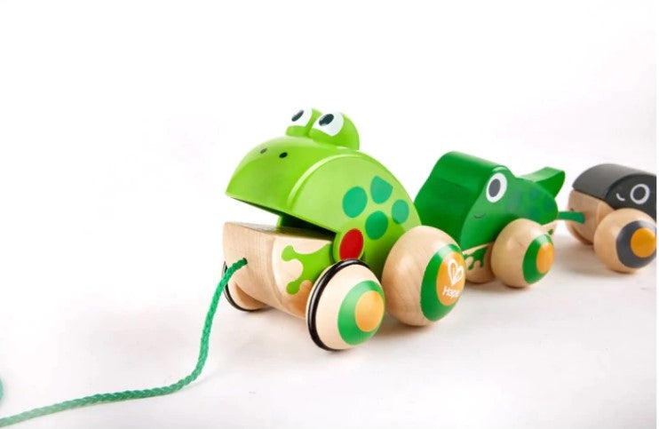 Cette jolie maman grenouille se promène avec ses petits. Elle aimerait que vous veniez aussi! Tirez sur sa ficelle et elle fera claquer sa bouche et se promènera avec vous pendant que sa petite grenouille et son têtard vacillent derrière.
