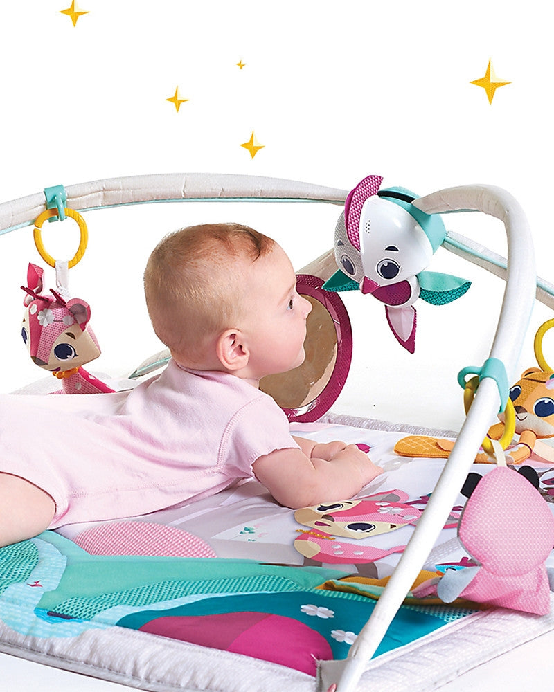 Le tapis Gymini Deluxe Petite Princesse est le tapis d'éveil qui permet à bébé de développer ses sens de nombreuses façons. Le tapis pour bébé Gymini a des arches réglables qui peuvent être placées dans diverses positions pour améliorer l'environnement dans lequel bébé se développera. Lorsque les arches sont ouvertes, bébé est à plat ventre et vous aurz assez de place pour partager des moments d'intimité. Un jouet électronique en forme d'oiseau, avec des lumières et une musique captivante, amusera bébé aussi bien lorsqu'il est attaché au tapis qu'en tant que jouet à emporter. Ce Gymini Deluxe stimule les sens de bébé et renforce ses capacités motrices grâce à une variété de jouets de développement amovibles et divertissants qui favorisent sa croissance. Les jouets s'enlèvent pour être emmenés en promenade. Le tapis de jeu doux peut facilement être utilisé comme tapis à langer et se lave très facilement à la machine