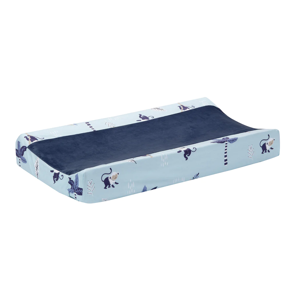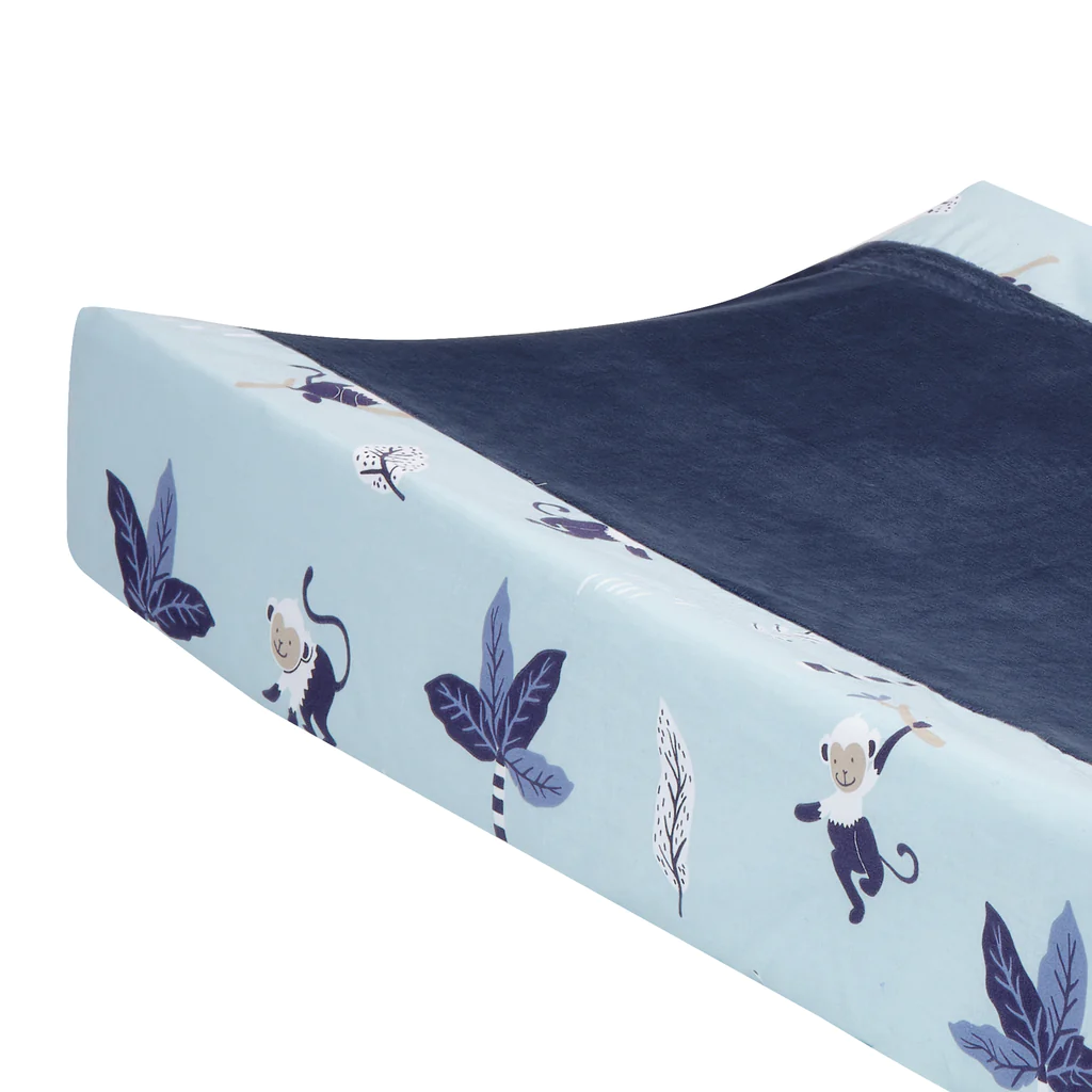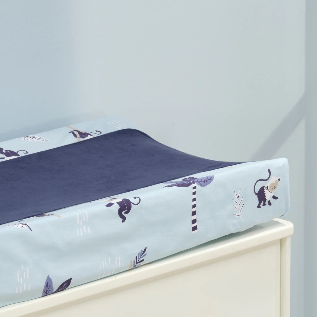 Les panneaux latéraux sont imprimés en coton avec d'adorables petits singes, des arbres, des feuilles et des gouttes de pluie blanches.