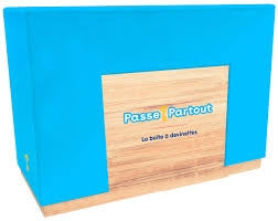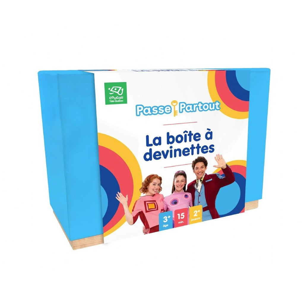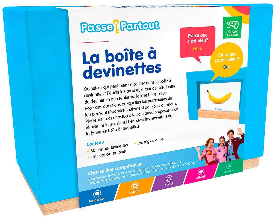 La boîte à devinettes de Passe-Partout est composée de 60 cartes devinettes et d'un support en bois pour tenir la carte debout.