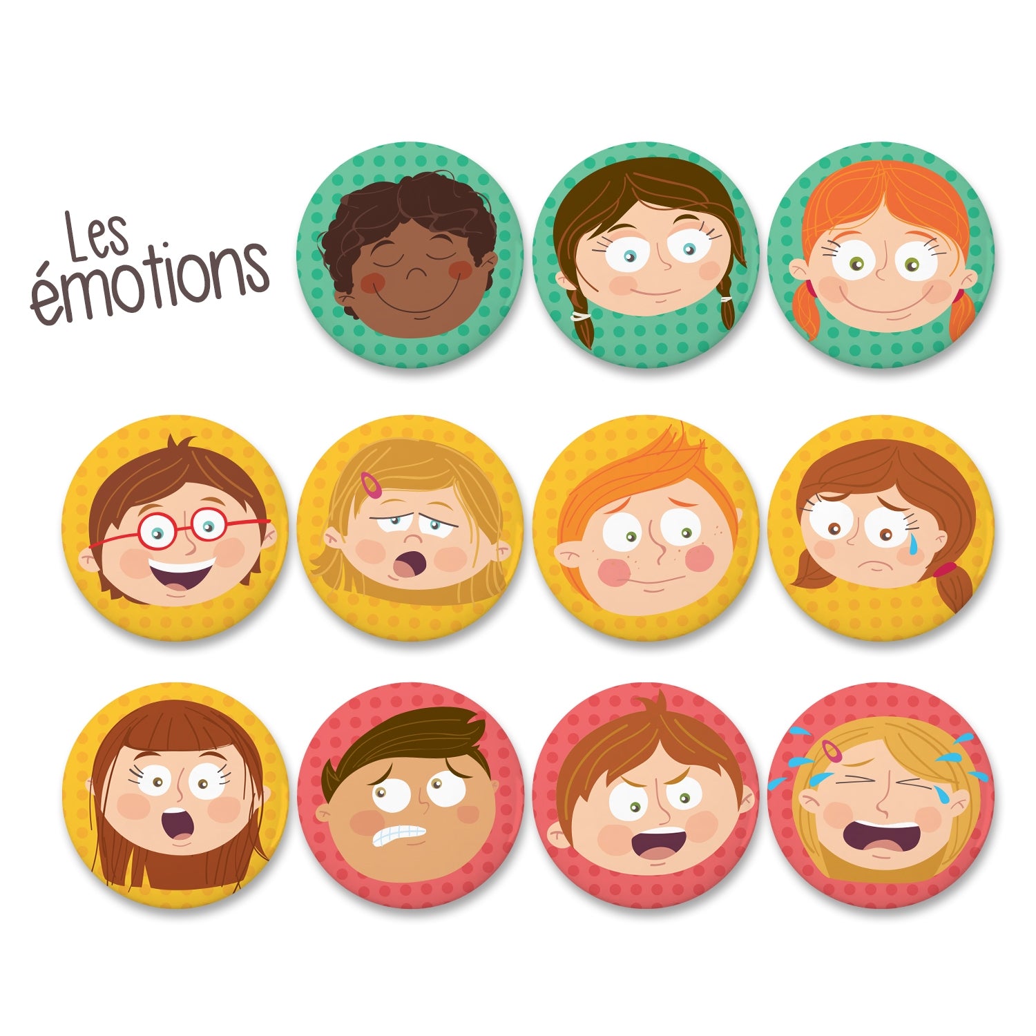 - 11 aimants ronds (Fier/Fière, Calme, Heureux/se, Gêné/e, Coupable, Surpris/e, Excité/e, Fatigué/e, Effrayé/e, Fâché/e, Triste)