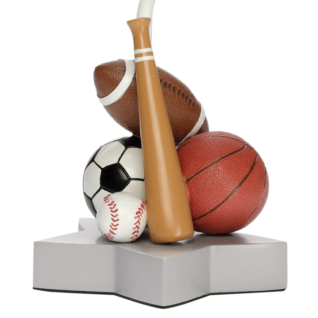 Ajoutez une douce lueur sportive à la chambre de votre enfant avec cette lampe en résine peinte à la main avec abat-jour. Elle comprend un ballon de basket sculpté, un ballon de football noir et blanc, un ballon de football texturé et une batte de baseball en bois naturel. Ils sont astucieusement placés sur une base étoilée grise. L'abat-jour de la lampe est sur un fond gris avec des bordures bleues. Le mot CHAMP est imprimé avec des étoiles rouges, blanches et marines.