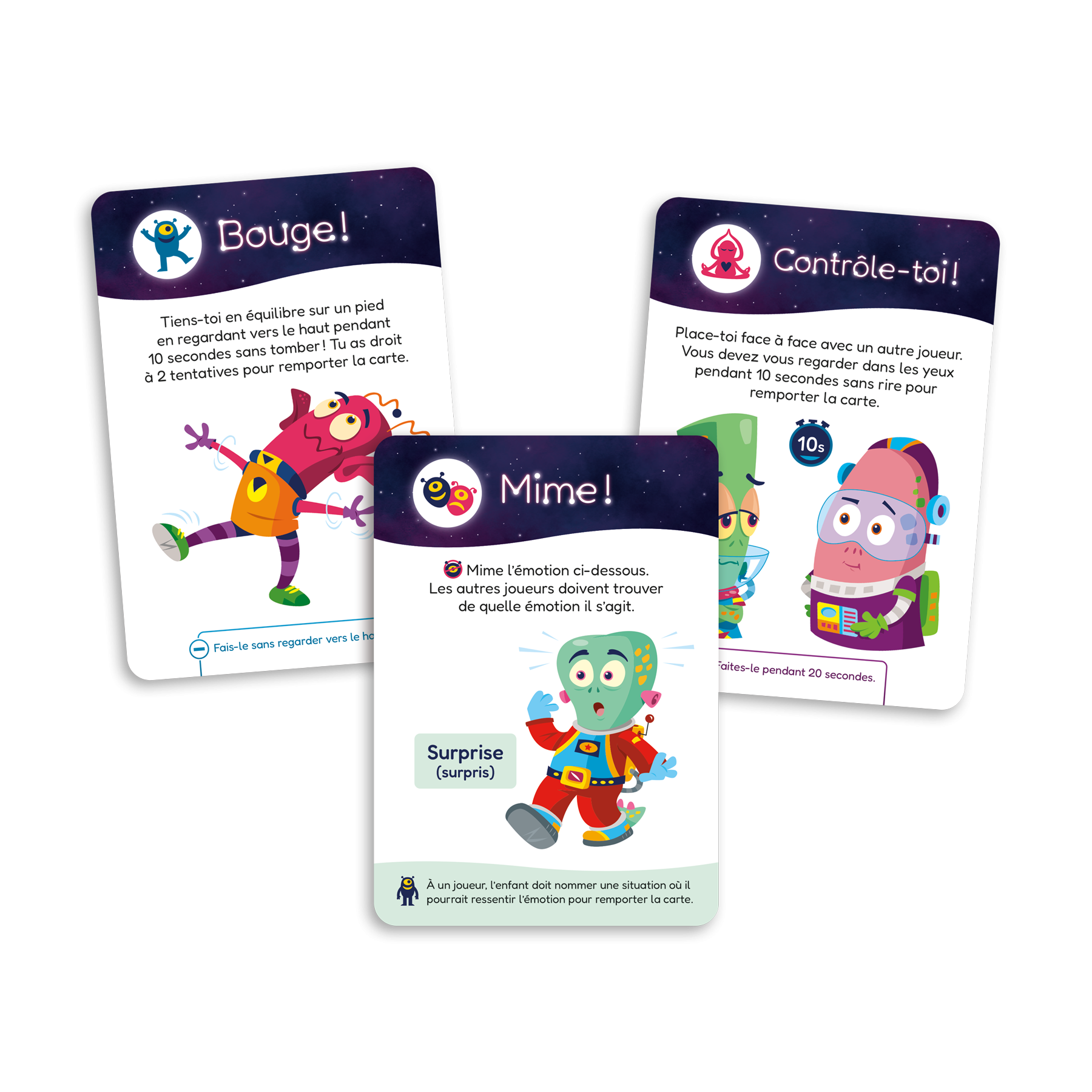 Le jeu comprend 70 cartes qui proposent des défis ludiques et variés sollicitant différentes habiletés motrices, socioaffectives, langagières et cognitives:
