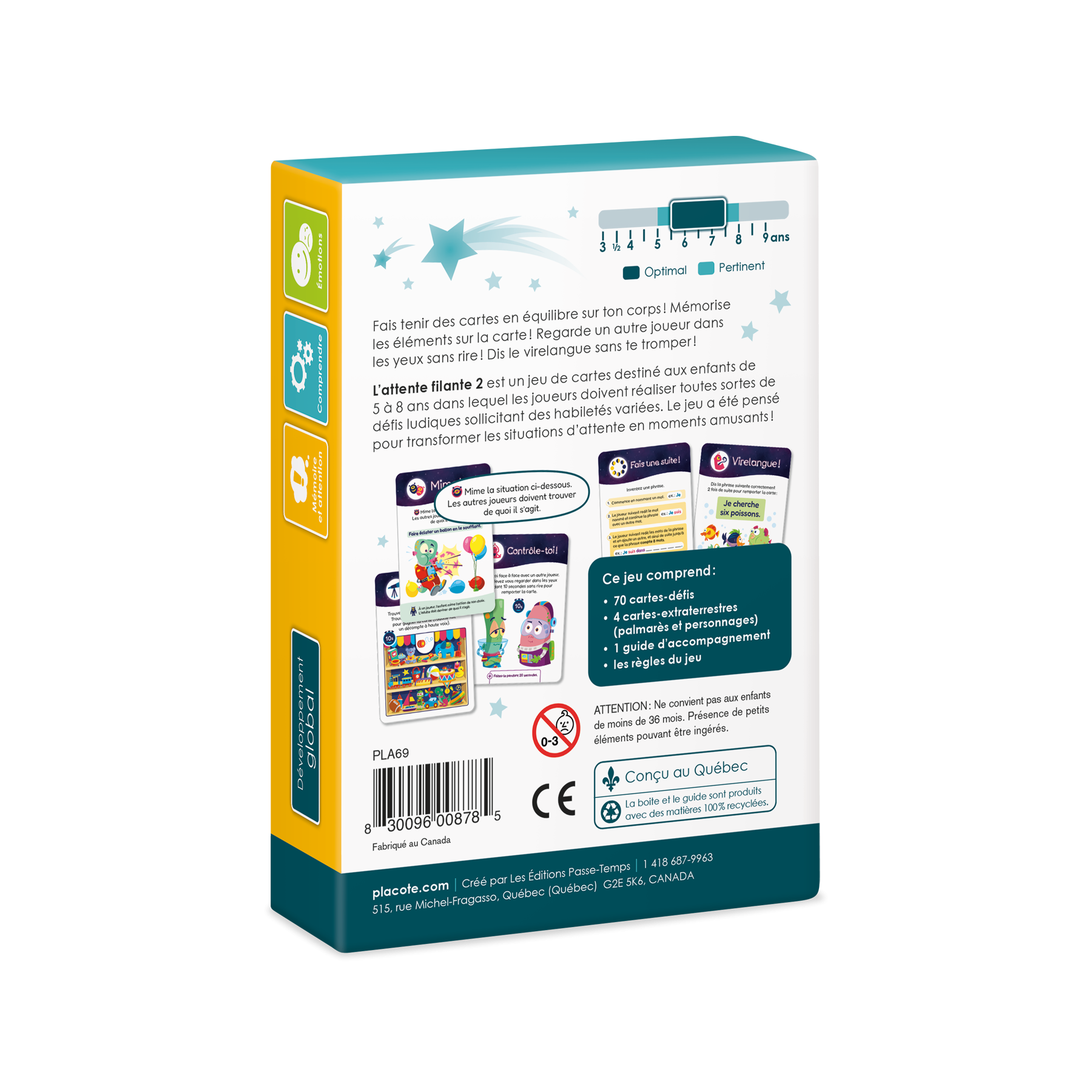 L’attente filante 2 est un jeu de cartes destiné aux enfants de 5 à 8 ans dans lequel les joueurs doivent réaliser toutes sortes de défis ludiques sollicitant des habiletés variées. Le jeu a été pensé pour transformer les situations d’attente en moments amusants!