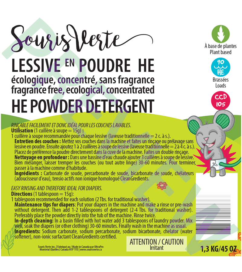 Carbonate de soude, percarbonate de soude, bicarbonate de soude, chélateurs (adoucisseur d’eau), tensio actifs non ionique homologué CleanGredients.