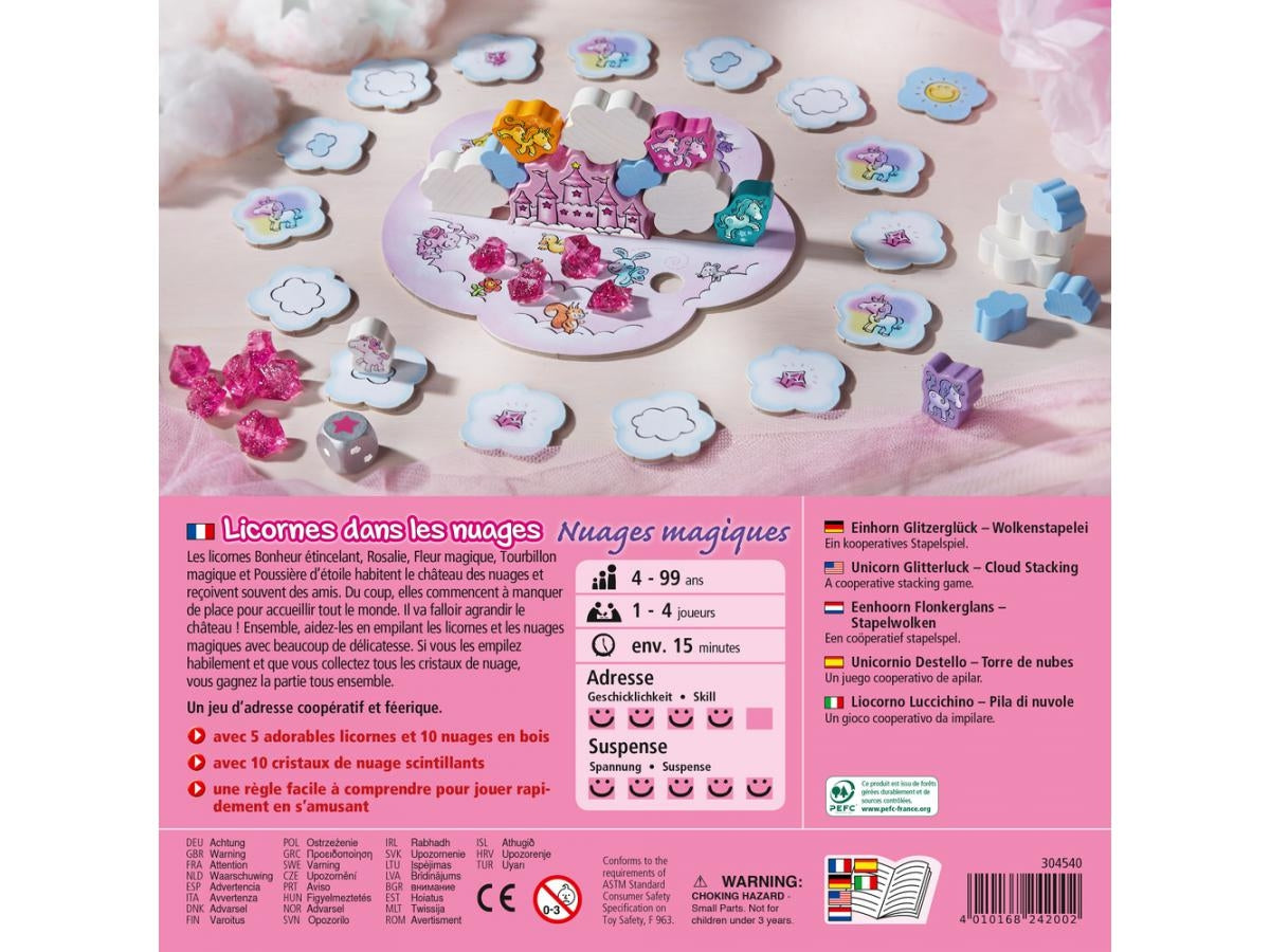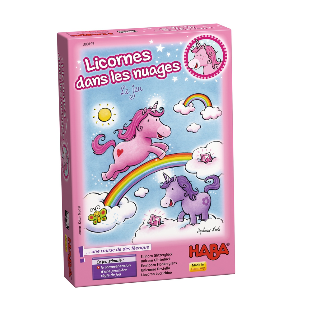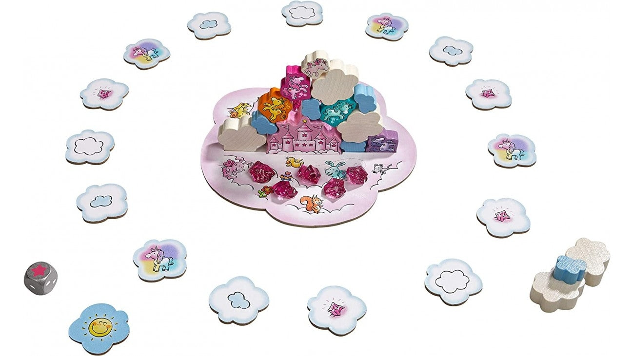 Les règles simples sont rapidement lues à voix haute et la course de dés commence aussitôt. Celui dont la figurine de licorne arrive en premier sur le nuage soleil et qui a ramassé le plus de cristaux de nuage en chemin remporte la partie!