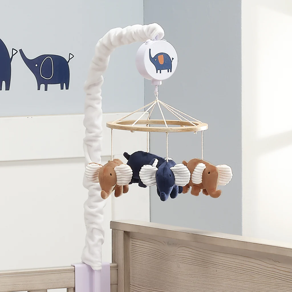 Deux éléphants en velours bleu indigo et deux éléphants en velours caramel, tous dotés d'oreilles en velours côtelé de couleur crème, tournent autour d'un anneau en bois sur ce charmant mobile musical à longue durée de vie. Le chouchou, qui recouvre le bras du mobile, est en velours blanc.