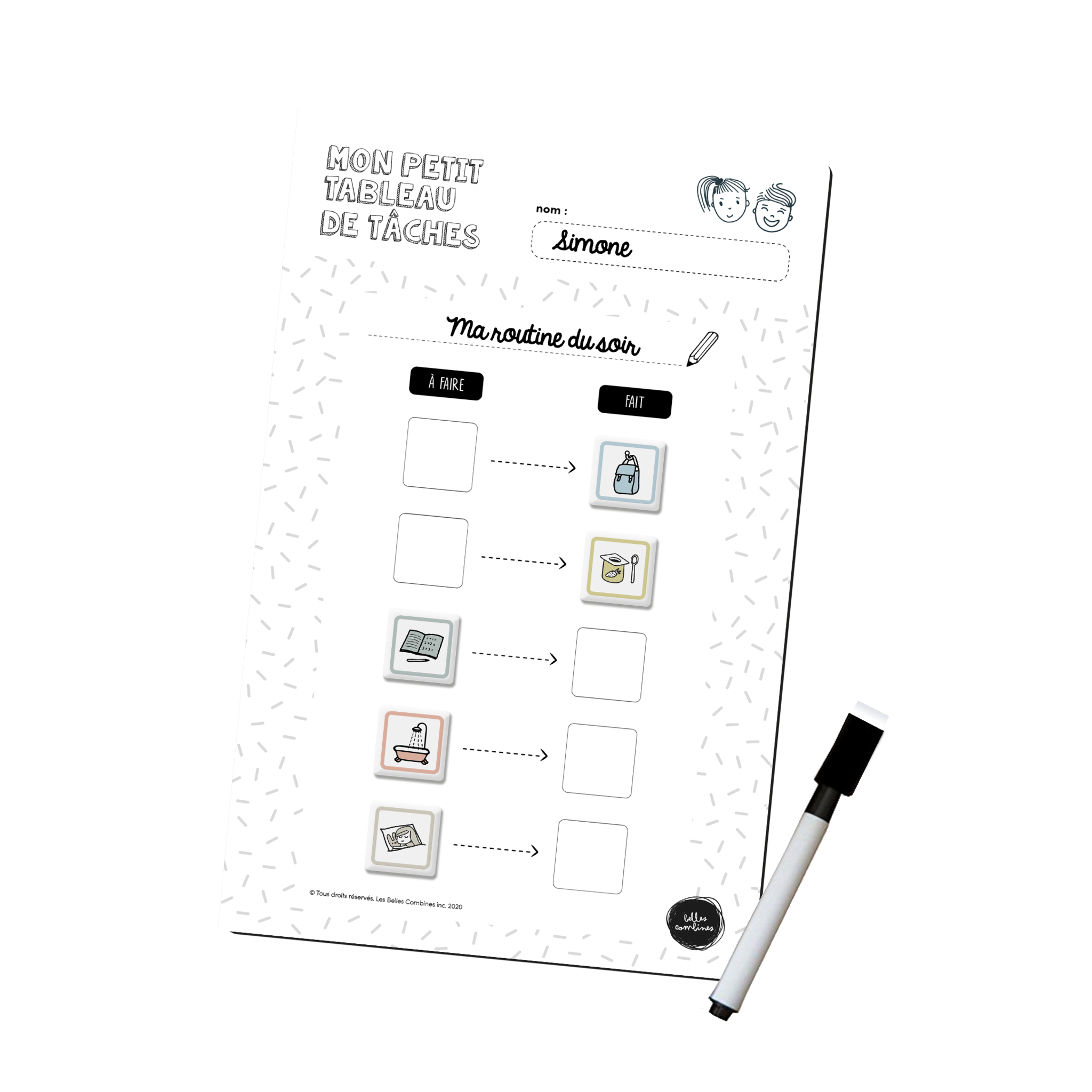 Ce tableau magnétique évolutif et polyvalent de Les belles combines vous permet de mettre en place une routine quotidienne ou de planifier une liste de tâches à effectuer pour votre enfant en 5 étapes.