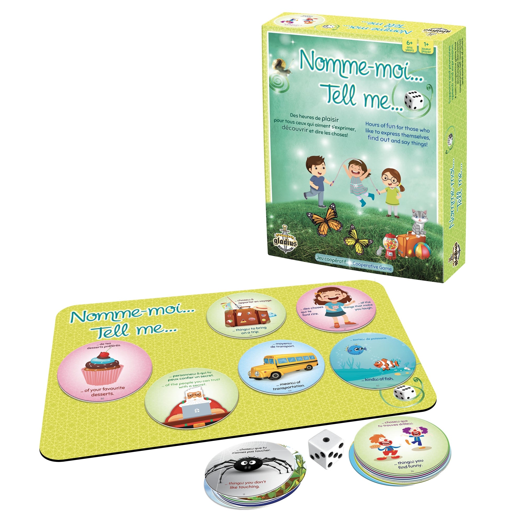 Nomme-moi... est un jeu qui vous fera vivre différentes émotions, du rire à la surprise, selon les réponses données par les joueurs, grâce aux multiples situations illustrées sur les pastilles de jeu. Tout en s’amusant, les enfants peuvent apprendre à s’interroger, à reconnaître leurs propres désirs, leurs préférences, leurs peurs, leurs inquiétudes, mais surtout à les exprimer. Ce jeu favorise également la communication et l’échange. Un jeu non compétitif où tous les enfants gagnent à y jouer. Il n’y a aucune mauvaise réponse, que des choses à exprimer, à entendre et à comprendre.