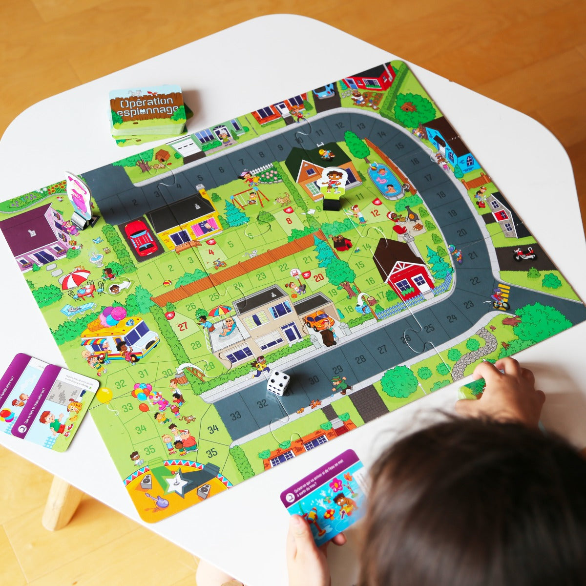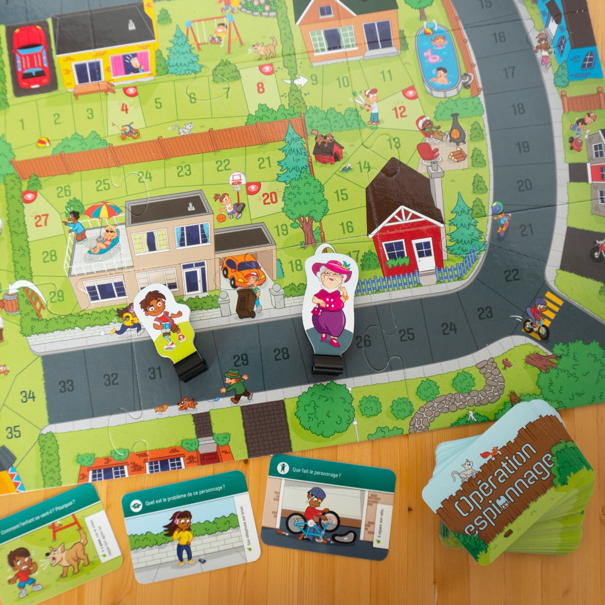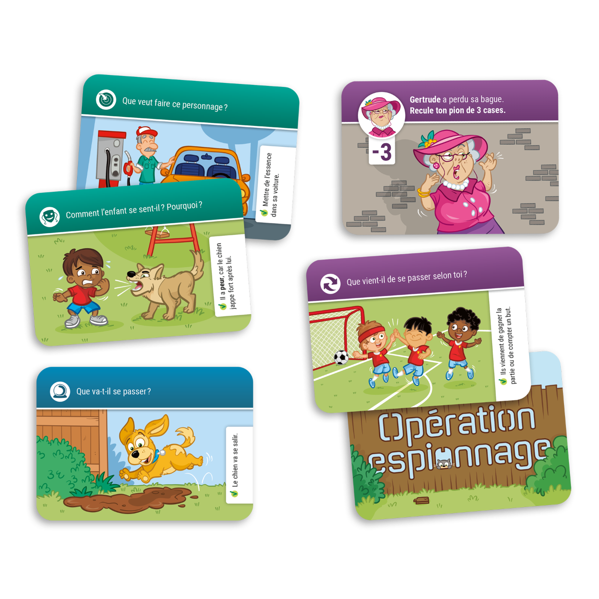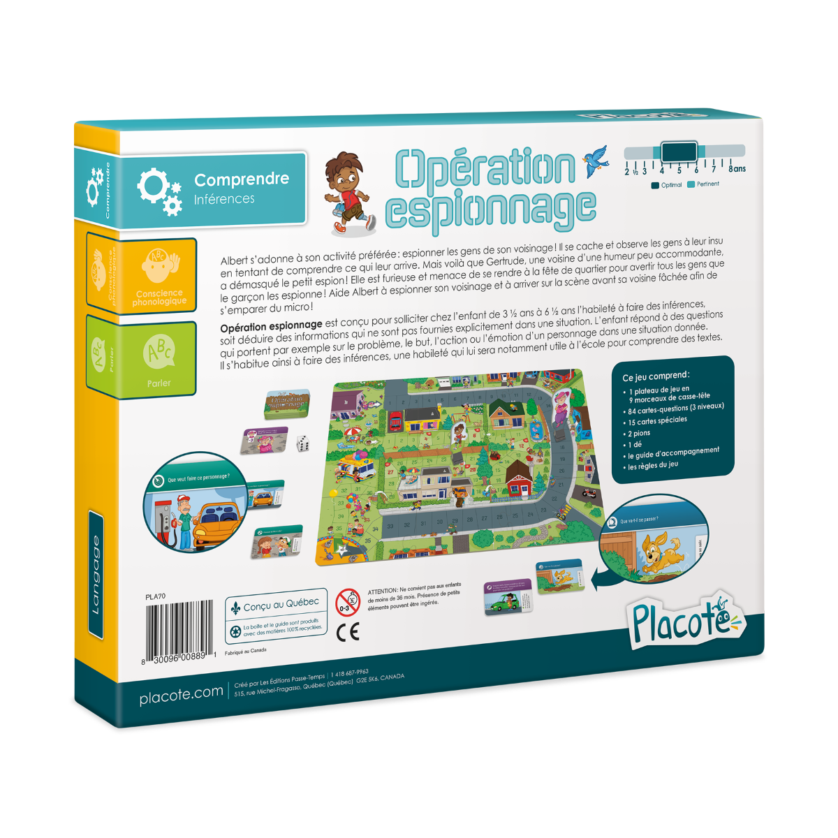 Opération espionnage est conçu pour solliciter chez l’enfant de 3½ ans à 6½ ans l’habileté à faire des inférences, soit déduire des informations qui ne sont pas fournies explicitement dans une situation. L’enfant répond à des questions qui portent par exemple sur le problème, le but, l’action ou l’émotion d’un personnage dans une situation donnée. Il s’habitue ainsi à faire des inférences, une habileté qui lui sera notamment utile à l’école pour comprendre des textes.