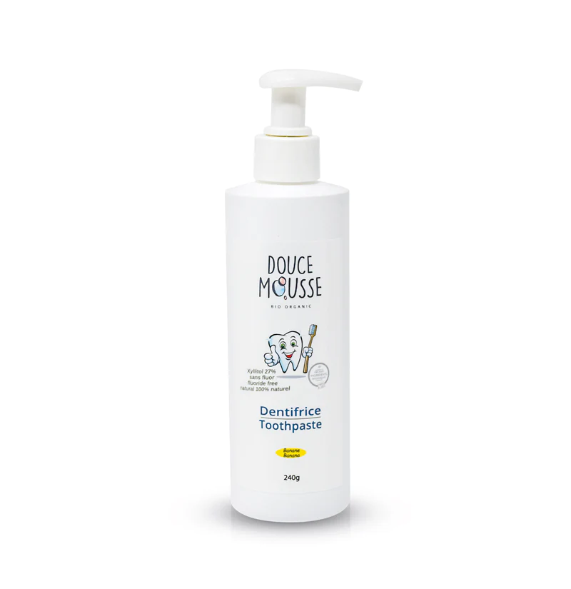 La compagnie Québécoise Douce mousse, vous offre un dentifrice naturel à base d’ingrédients biologiques à saveur de banane. Elle est sans fluor et contient 27% de *Xyllitol.