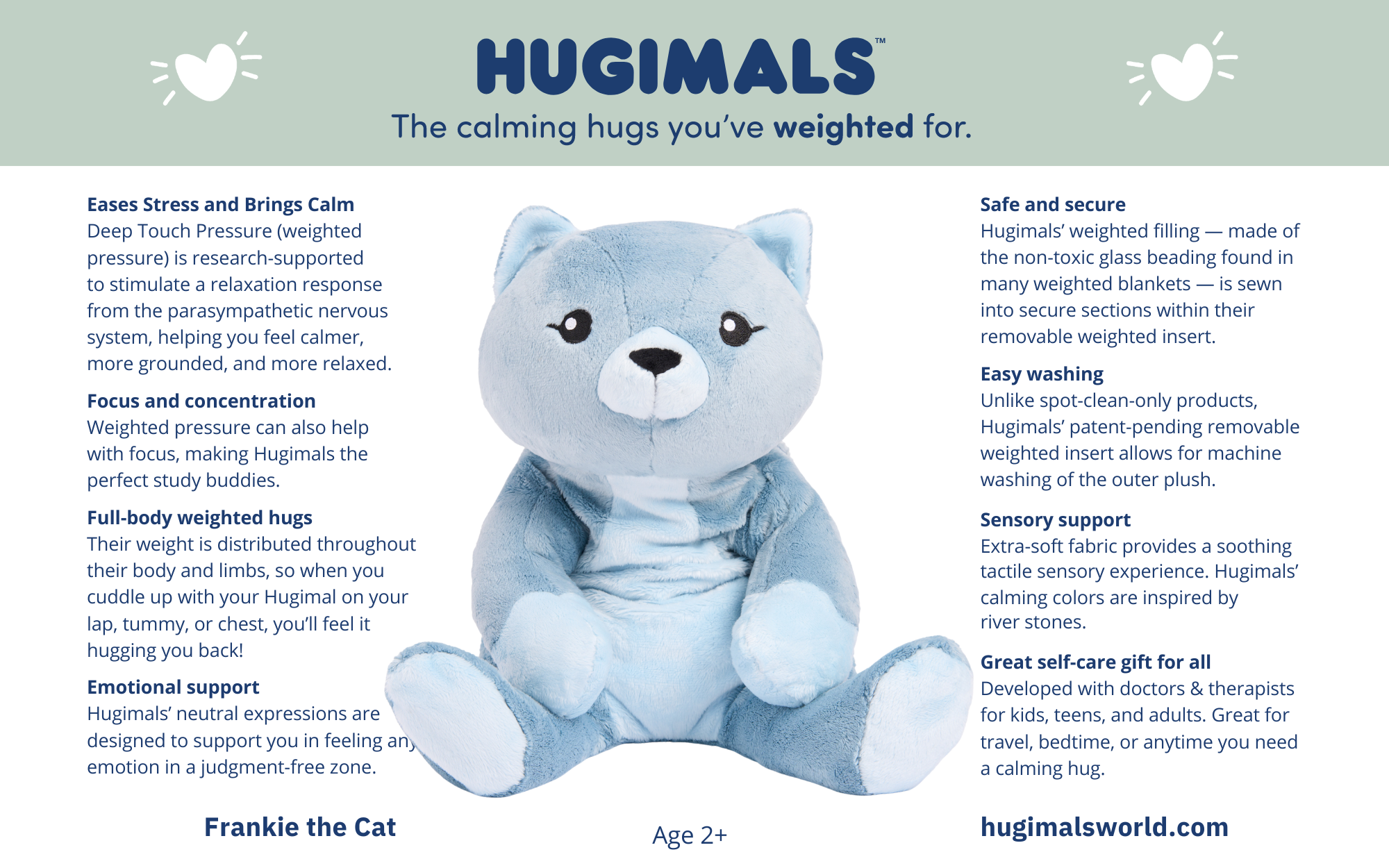 - AVANTAGES SENSORIELS : La pression du toucher profond pondéré peut aider à lutter contre l'anxiété, le stress et le sommeil. Il peut également aider à se concentrer, ce qui fait des Hugimals de parfaits compagnons d'étude ou de travail.