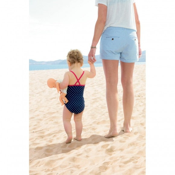 Cette poupée de 30 cm. est parfaite pour le bain, la piscine ou la mer. Elle résiste à l’eau savonneuse, le chlore ainsi que l’eau salée.