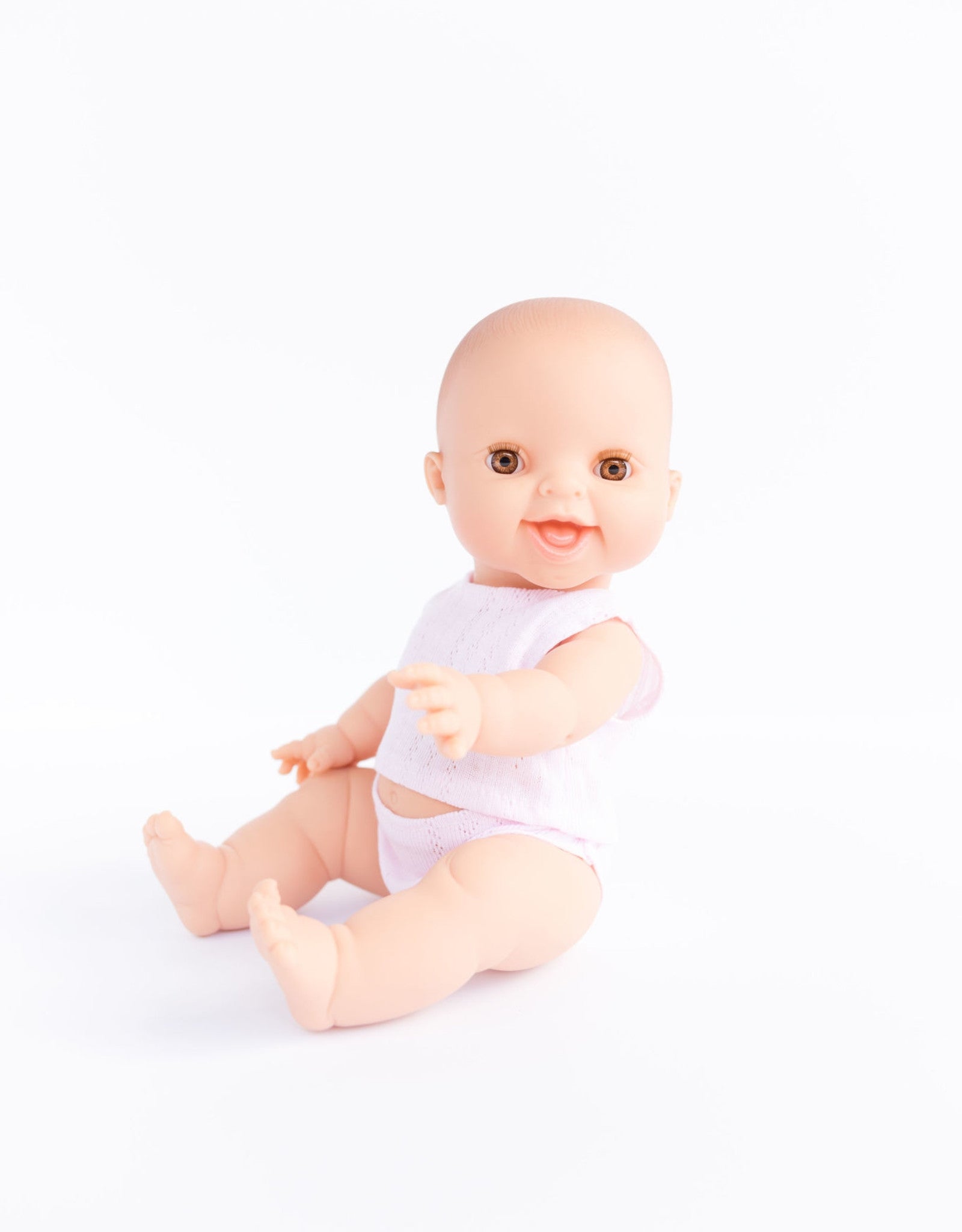 Vendue habillée d'une camisole et d'un caleçon roses.