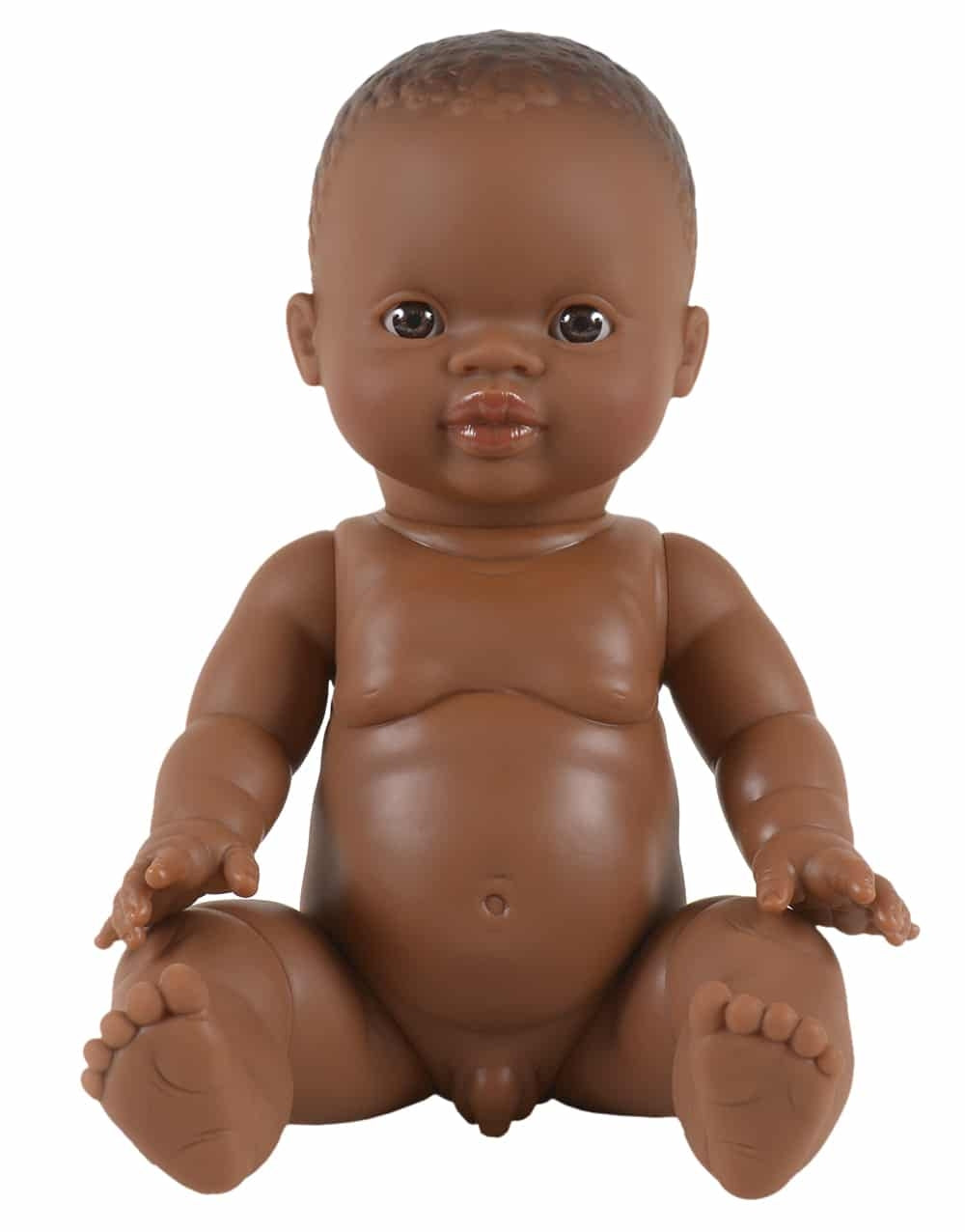 Poupée sexuée aux bras et jambes articulés. On peut lui tourner la tête et les yeux ne sont pas mobiles. |