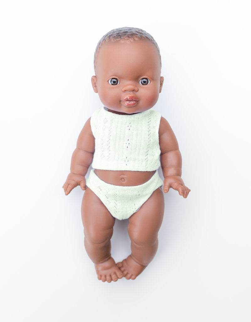 Vendue habillé d'une camisole et d'un caleçon verts pâles.