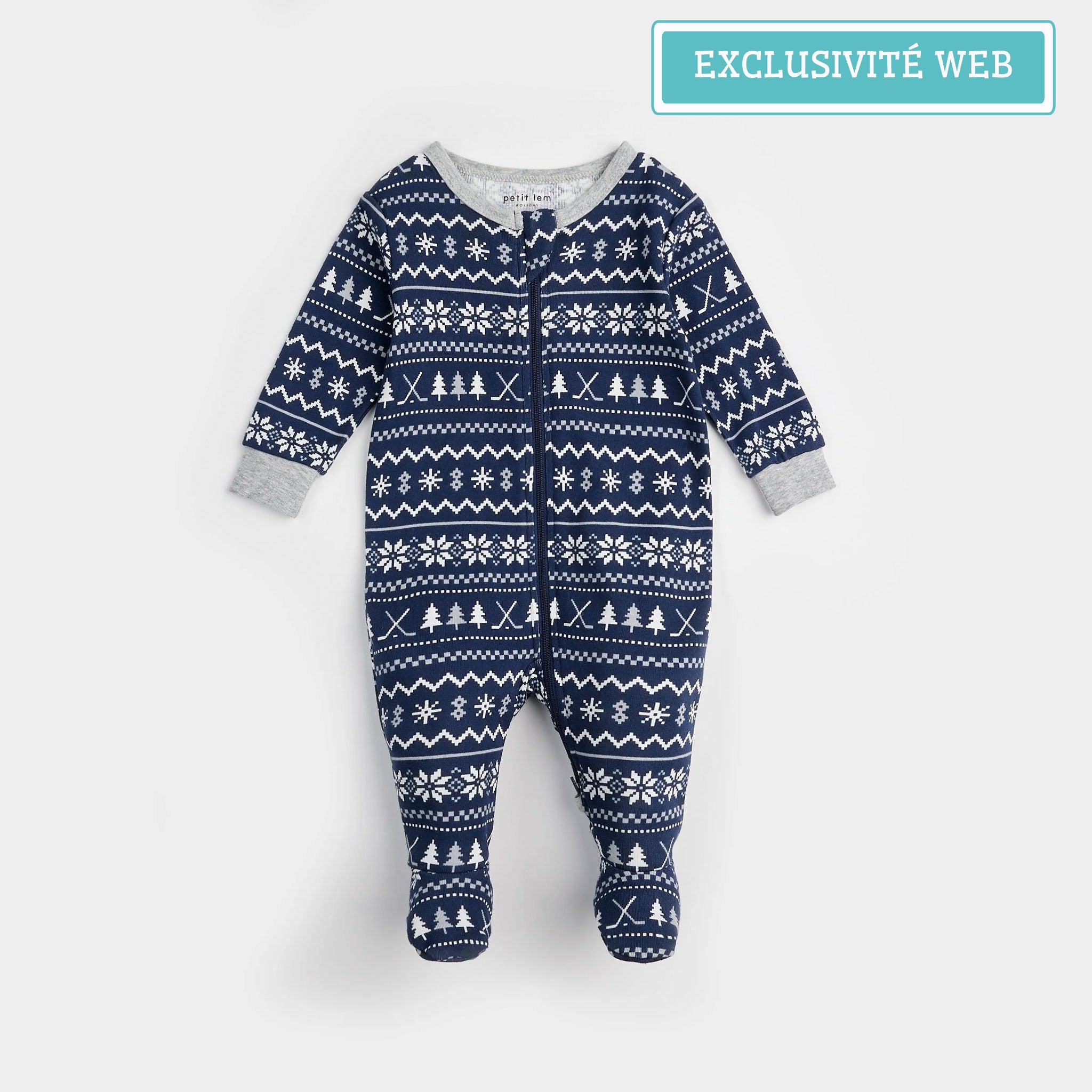 Cette dormeuse douillette arbore un motif jacquard classique avec une touche sportive ; entre les arbres et les rayures se cachent des bâtons de hockey pour ceux qui sont destinés à devenir des champions sur glace. Avec des modèles assorties pour papa et les grands frères, ce vêtement est la tenue idéale pour les grasses matinée du dimanche de votre bout de chou.
