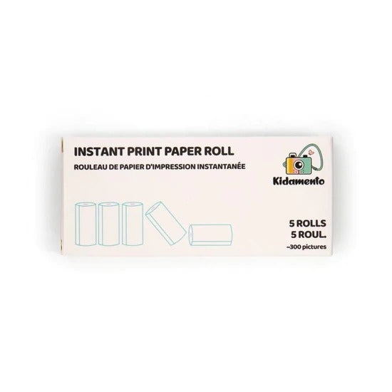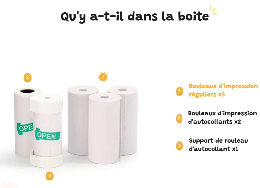 Chaque paquet est livré avec 5 rouleaux de papier d'impression. Deux rouleaux ont un dos adhésif pour que l'enfant puisse le couper et le coller sur n'importe quelle surface plane.