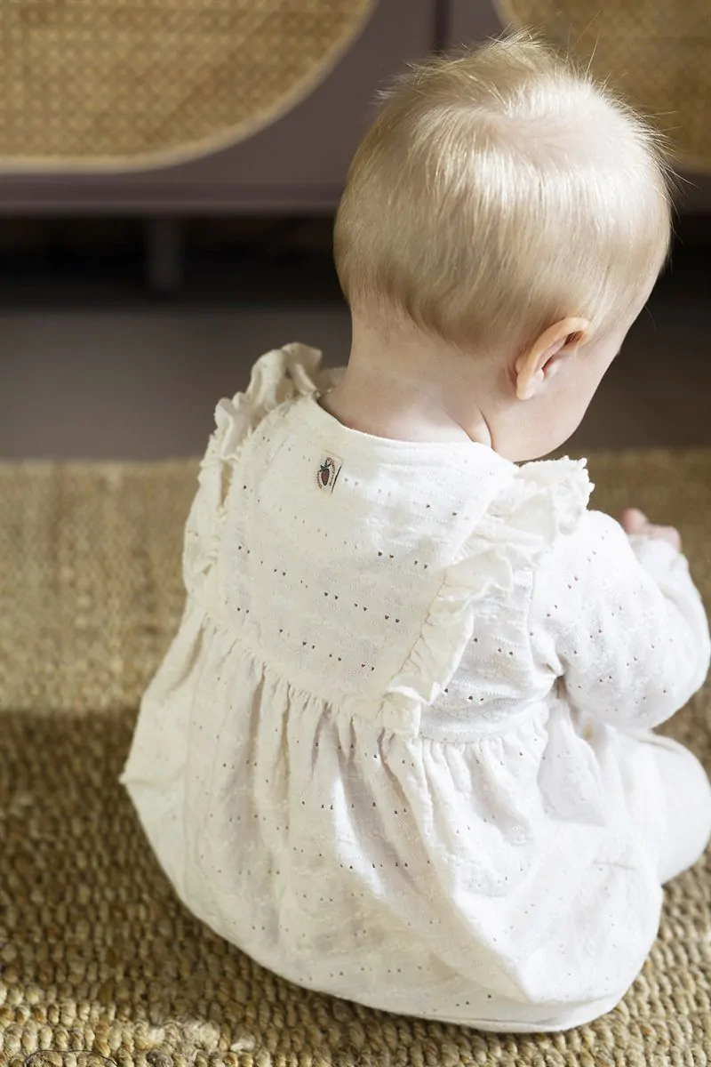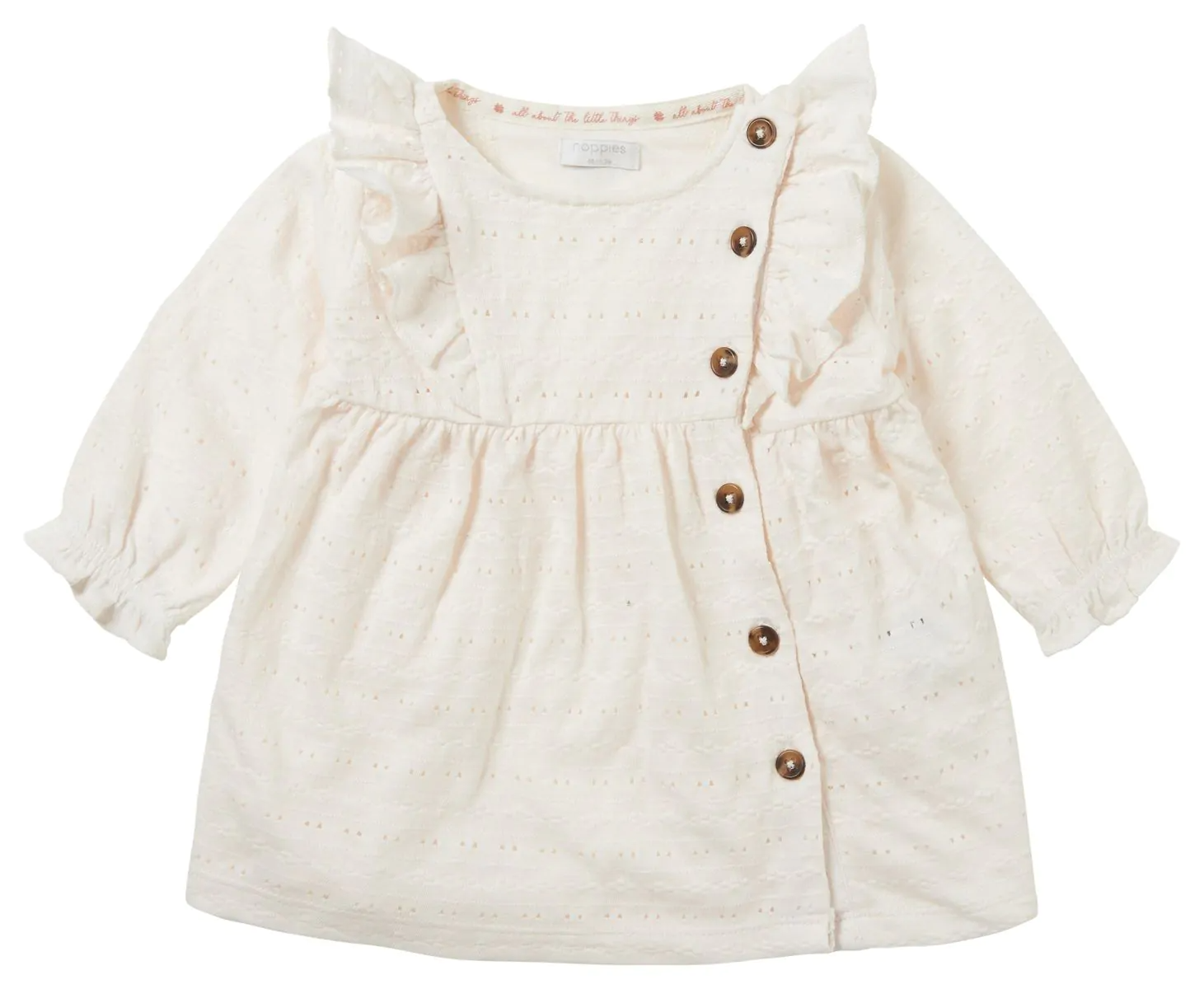 Jolie robe de la collection Noppies Baby. La robe Noble a des boutons de haut en bas, ce qui évite de devoir la passer par la tête. Plus agréable pour votre bout de chou ! La robe est composée du coton doux et ornée d’adorables volants. Elle est élastique !