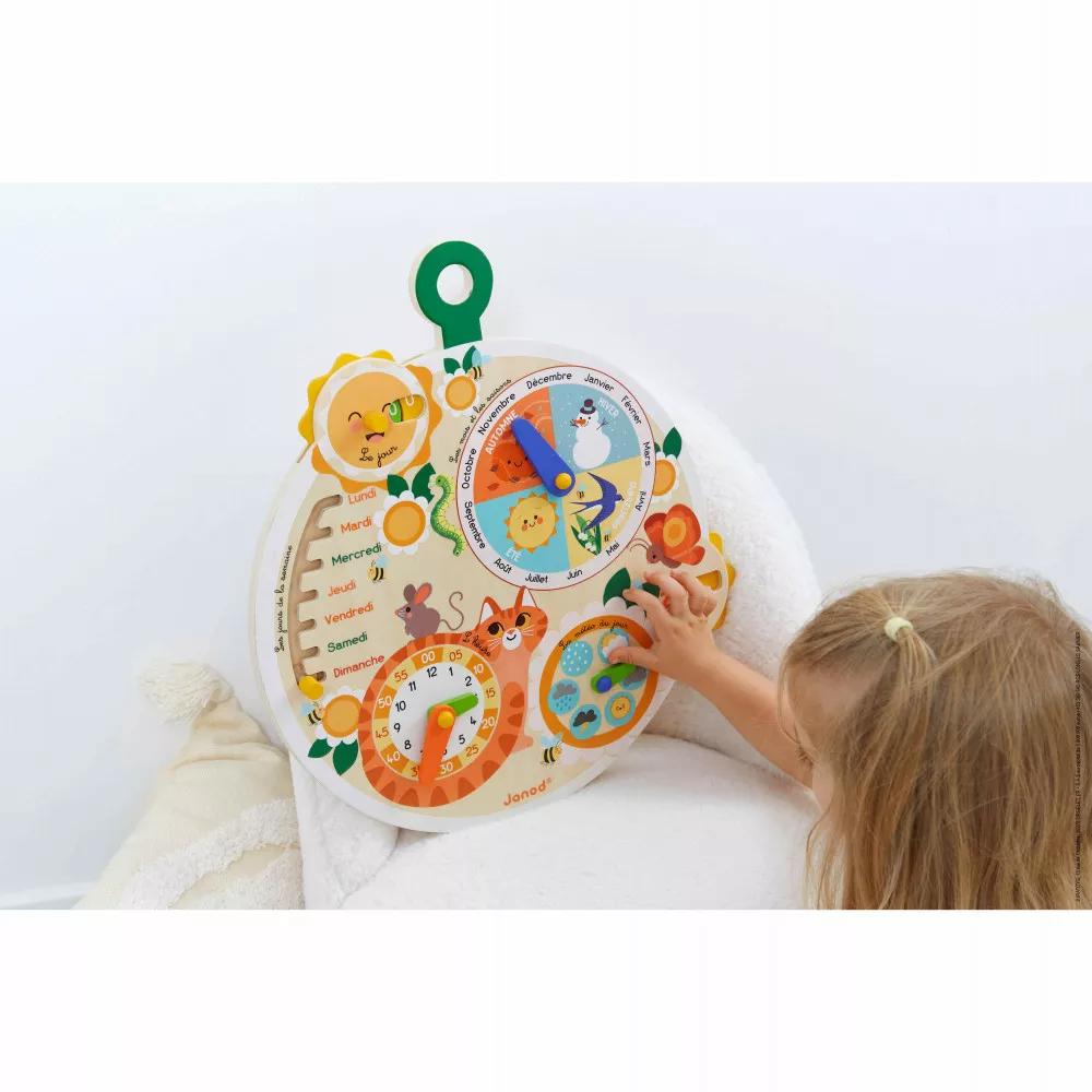 Place à la météo : on jette un œil par la fenêtre et on place l'aiguille sur le dessin correspondant. Idéal pour les enfants qui apprennent à s'habiller seuls ! Pour aller plus loin, on peut même indiquer l'heure sur le dos d'un adorable chat roux. Les aiguilles sont de 2 couleurs distinctes pour différencier les heures des minutes, pratique quand on commence à apprendre à lire l'heure ! Ce calendrier en bois joliment décoré avec des éléments naturels et de petits animaux se fond à merveille dans une chambre d'enfant. Il laisse apparaître du bois naturel, certifié FSC®. Petites abeilles et autres papillons accompagnent les enfants en maternelle qui peuvent reproduire les rituels en place à l'école. Cette roue du temps est aussi un jouet éducatif pour les plus grands qui apprennent à lire. Elle est disponible en français uniquement.