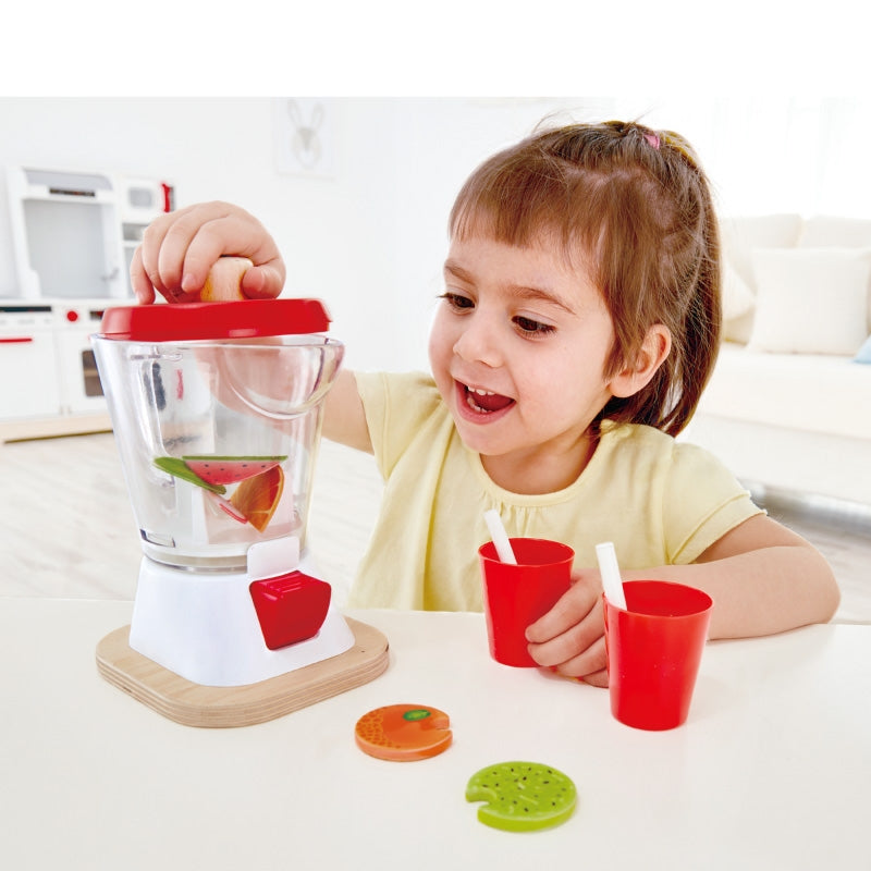 Ce mélangeur à smoothie de Hape est parfait dans la cuisinette de votre enfant. Il vous confectionnera des smoothies frais du jour en trois étapes faciles. Il suffit de mettre les légumes et fruits dans le mélangeur, actionner le mécanisme à l'aide du bouton rouge pour le faire tourner comme un vrai mixeur et verser dans les verres!