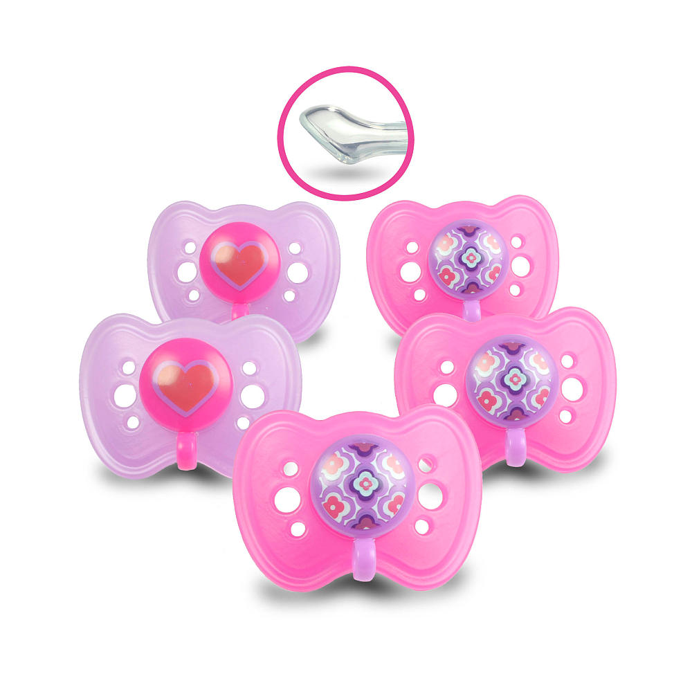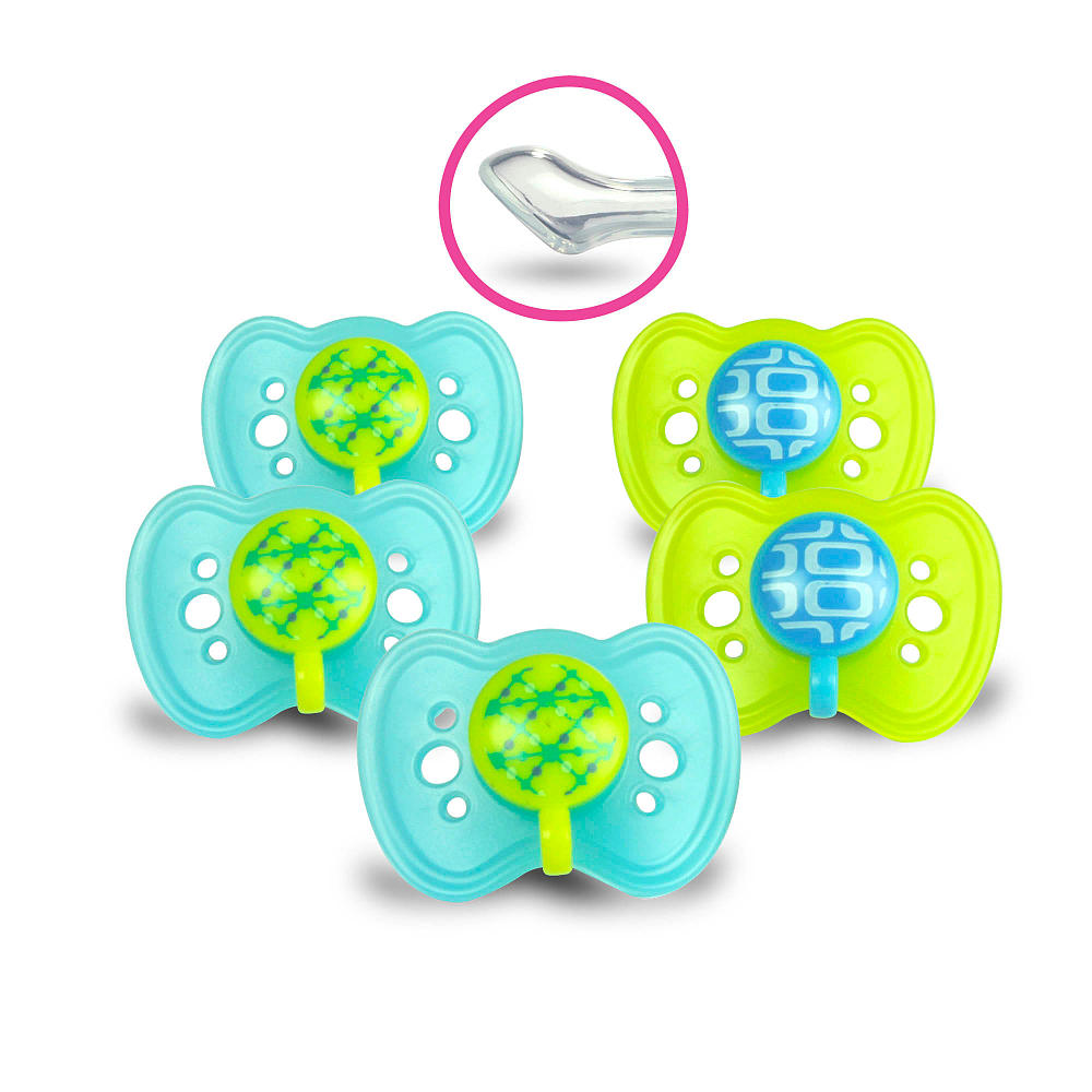 Cette sucette orthodontique innovatrice et résistante en silicone est d'une forme qui s'ajuste au visage de bébé sans aucun risque de boucher son nez. Offertes en paquet de cinq.