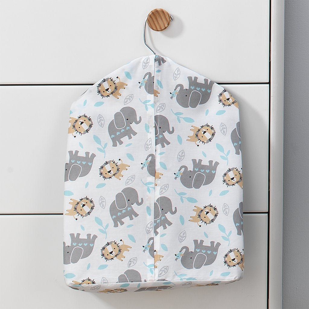 Le support à couches de la collection Jungle Fun est conçu par Lambs and Ivy. Il représente les animaux de la jungle comme le lion et l'éléphant. Le tissu est un mélange de coton et polyester blanc imprimé qui est durable et facile d'entretien. Le support est inclus et il est pivotant pour que vous puissiez l'accrocher à l'endroit qui vous convient. Il peut contenir jusqu'à 30 couches jetables et un peu moins de couches lavables.