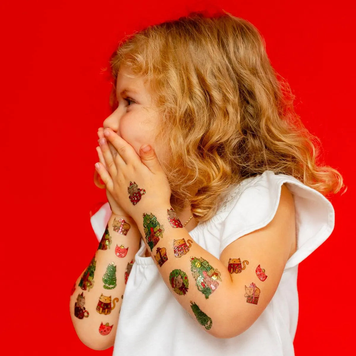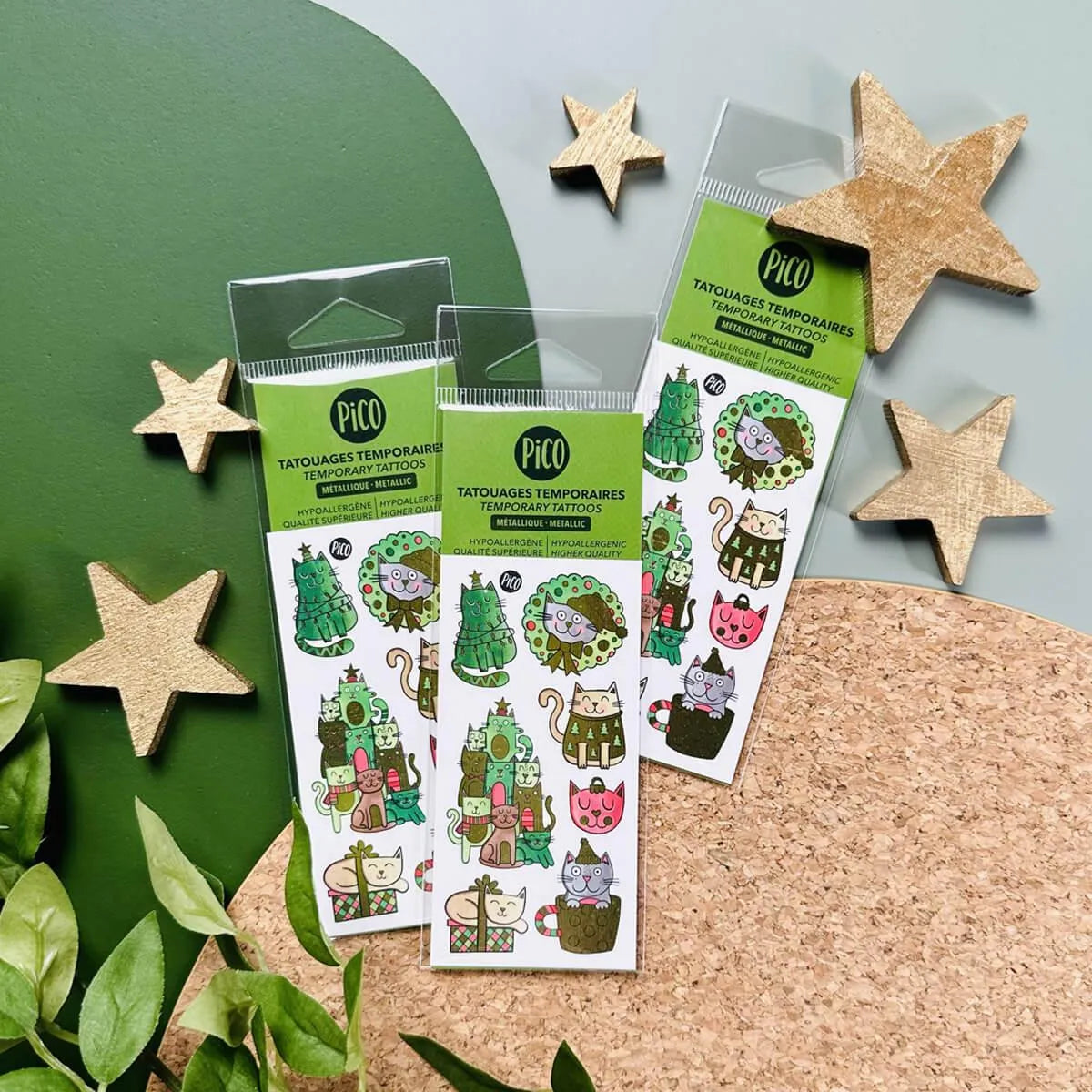 Le chatpin de Noël et ses amis est le tatouage parfait pour les amoureux des chats. Les chats sont prêts pour participer à la décoration de la maison et à la préparation des festivités. Avez-vous remarqué que l'un d'eux a même mis son chandail de Noël pour l'occasion ? Les tatouages sont métallisés, donc ils ont un petit quelque chose de spécial. Bibi le chat gris veut aussi faire partie de la fête de Noël!